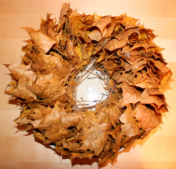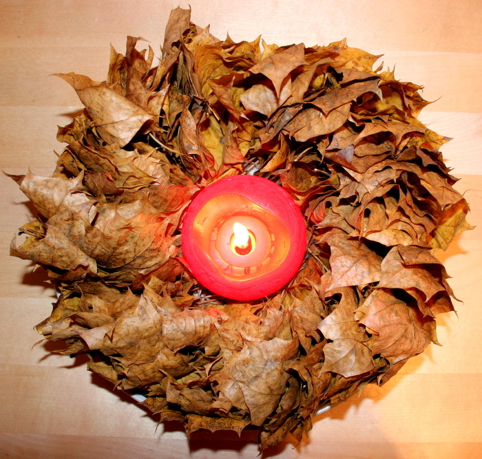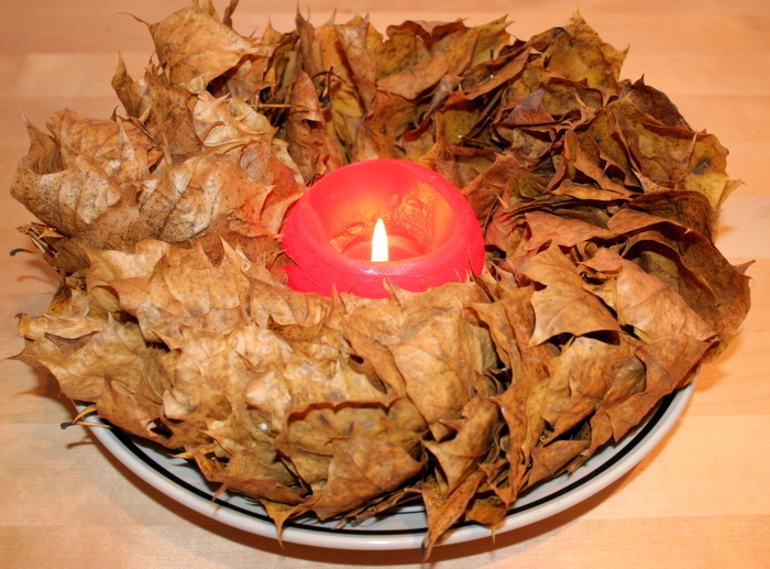 Kādu dienu kopā ar Adrianu lasījām kļavu lapas un taisījām lapu virteni – likām tās vienu uz otras un tad cauri izdūrām adatu ar diegu. Lapas nebija sausas (mitras un smagas), tāpēc virteni nekur nevarējām piekārt, tad nu uzlikām to uz viena no virtuves lielajiem šķīviem un re – uztaisījām svečturi, kurš rudenīgos vakarus padara īpaši jaukus.