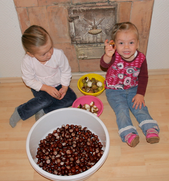 Oktobra sākumā mums no laukiem tika atsūtīts liels maiss ar kastaņiem (kastaņi bija ar visām “mājiņām”), kurus Adriana (2,5 g.v.) kopā ar māsīcu Emīliju (2,8 g.v.) (un mazu manu palīdzību) izlobīja.
