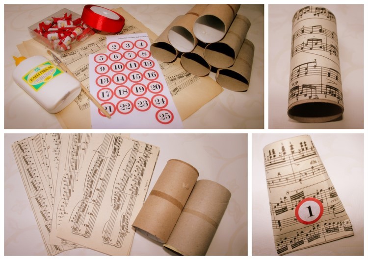 2. Mazliet paplacina rullīšu serdītes un aplīmē ap tām nošu papīra loksnes (šo var darīt arī ar līmzīmuli).