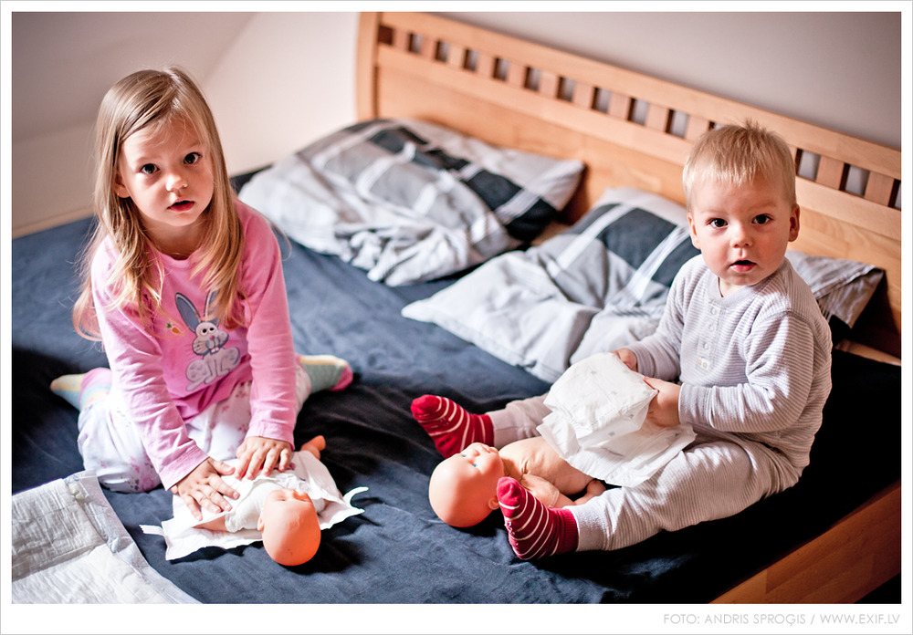 Te Adriana ar Niklāvu, pilnīgi pēc pašu iniciatīvas, mācās likt pamperus lellēm. :)