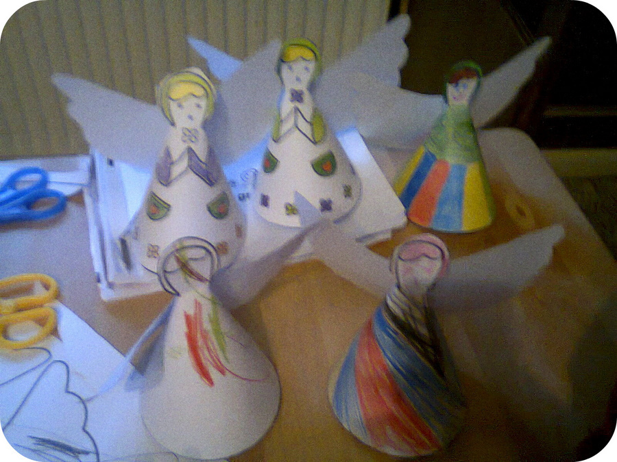 Eņģeļus no papīra šķīvja mēs negatavojām gluži tā, kā plānā rakstīts. Pirms rādīju darbiņu Adrianai, pati mēģināju eņģeli no šķīvja uztaisīt, un tā kā ar trīs reizēm man nesanāca, tad negribēju vairs tērēt šķīvjus un atradu internetā eņģeļu “piegrieztni”, kuru izdrukāju. Tad to izkrāsojām, izgriezām un salocījām.