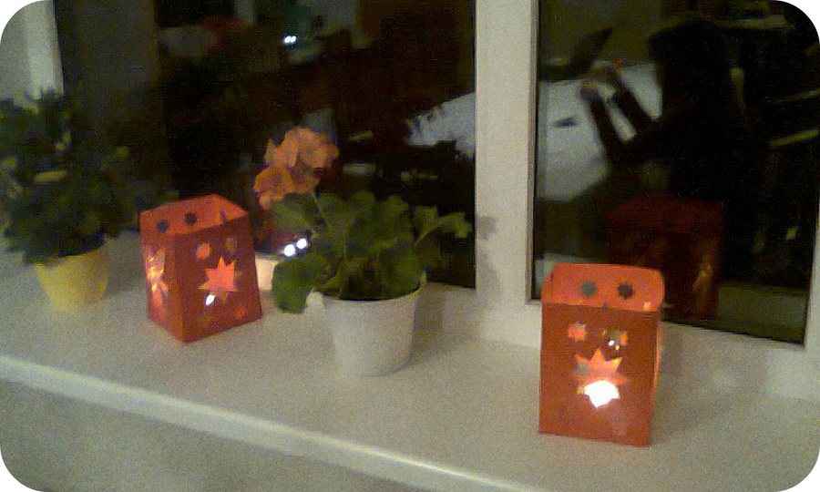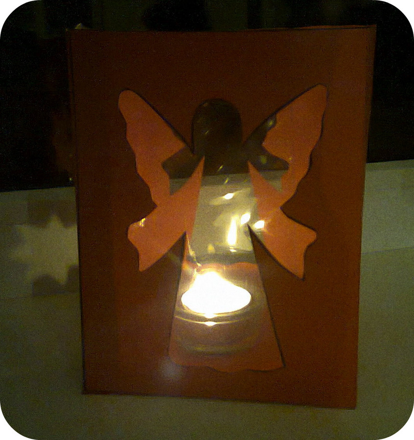 Lukturīši sanāca dikti eleganti. Eņģeļus un zvaignes izgriezu es, bet pārējo darīja Adriana – izgrieza lukturi pa perimetru, salocīja, uzlika līmi, pieskočoja sagrieztas caurspīdīgās kabatiņas (stikliņa efektam).