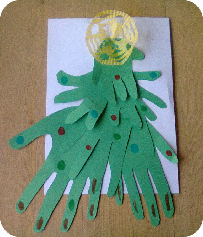 Vēl mums tapa arī “pirkstiņegle” – Adriana, es un tētis apvilkām savas plaukstas un tad no tām izveidojām egli.