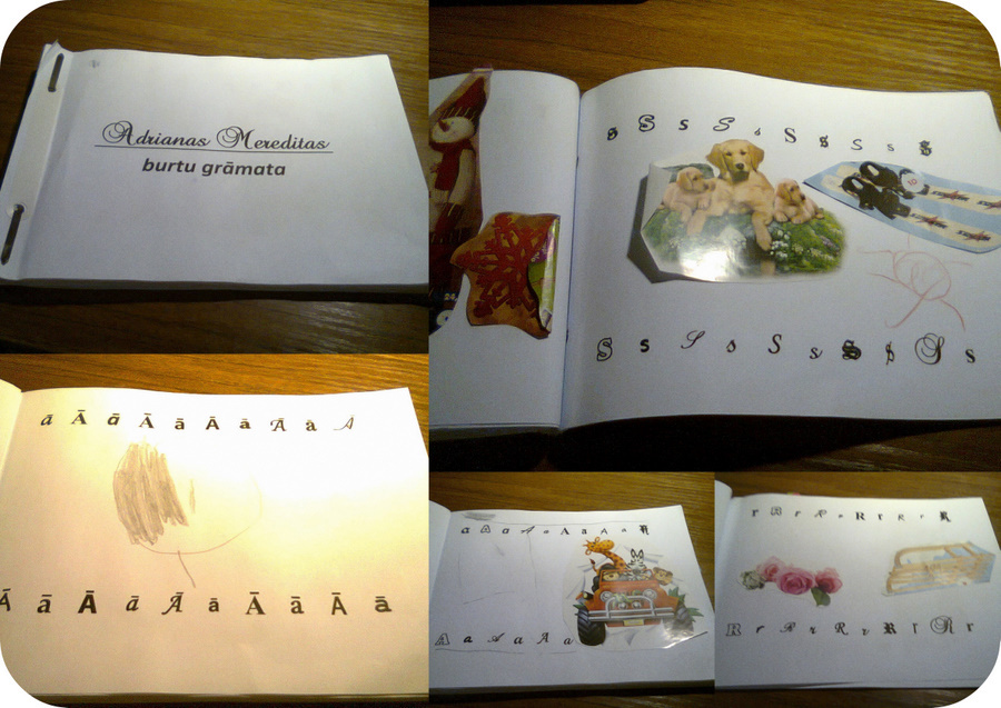 Adrianas burtu grāmata. Kopā ar Adrianu (iesaistījās arī Niklāvs) graizījām žurnālus un meklējām bildes, ko pielīmēt pie katra no burtiem. Pie kādiem Adriana arī pati šo to piezīmēja, piem., pie burta “Ā” viņa uzzīmēja ābolu, pie “S” – sauli.