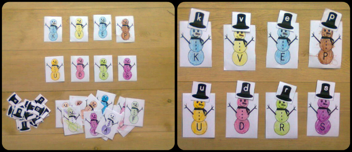 Sniegavīrus ar burtiem izdrukājām un, lai būtu interesantāk, kopā ar bērniem arī izkrāsojām. Adrianu iesaistīju arī materiāla tapšanā. Viņa krāsoja un grieza gan sniegavīrus, gan cepures. Pēc tam kopīgi spēlējām spēli.