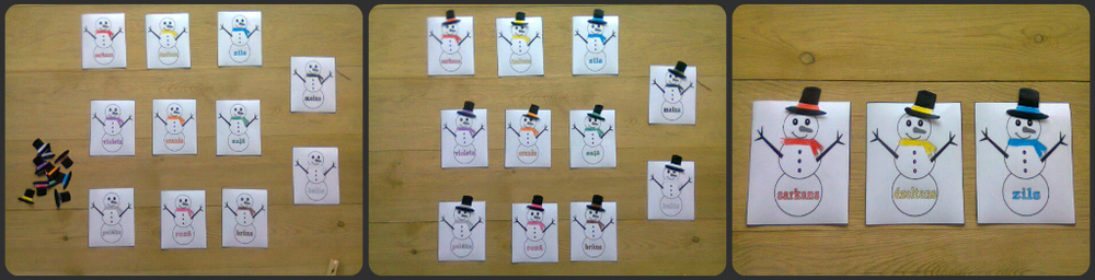 Internetā uzgāju sniegavīru spēles – par burtiem un krāsām. Spēles uzdevums ir attiecīgajam sniegavīram atrast īsto cepuri. Vai nu ar īsto burtu vai īsto krāsu. Man par lielu prieku Niklāvam uzdevums ar sniegavīriem un krāsām (pamatkrāsām – zilu, sarkanu un dzeltenu) izdevās. Kā rakstīju iepriekš, tad vēl pirms nedēļas viņam tas nesanāca. ;)