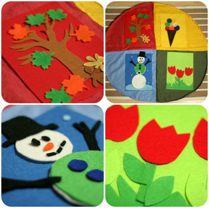 Sākumā uz apļa sektoriem/gadalaikiem varētu likt kādas 3D figūriņas, kas būtu saistītas ar konkrēto gadalaiku. Var arī paņemt kaut ko no bērna apģērba un arī sašķirot pa gadalaikiem.