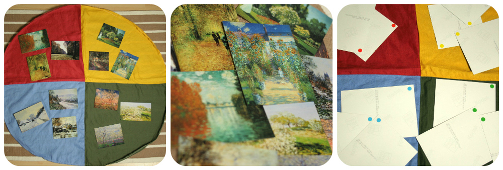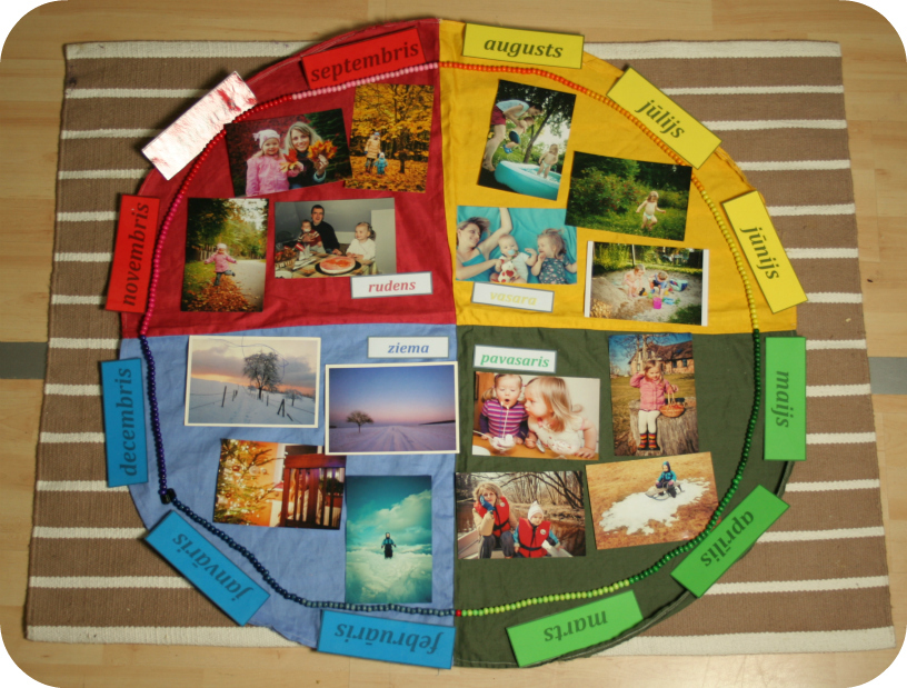 Šo materiālu bērniem demonstrēju šādi – izkārtoju apli uz paklāja un tad pastāstīju, ka ir četri gadalaiki, kā tie viens otram seko (piezīme vecākiem – tā kā Zeme griežās pretēji pulksteņa rādītāja virzienam, tad arī aplī gadalaiki ir izkārtoti pretēji mums pierastajam virzienam) un, kā mēs katrā gadalaikā varam darīt atšķirīgas lietas. Man bija sagatavotas fotogrāfijas ar Adrianu katrā no gadalaikiem. Rādīju tās bērniem, runājām par to, kas fotogrāfijā redzams (piem., 18. novembra svinības, Lieldienu olu meklēšana, Adrianas dzimšanas diena) un tad to ielikām attiecagajā sektorā.