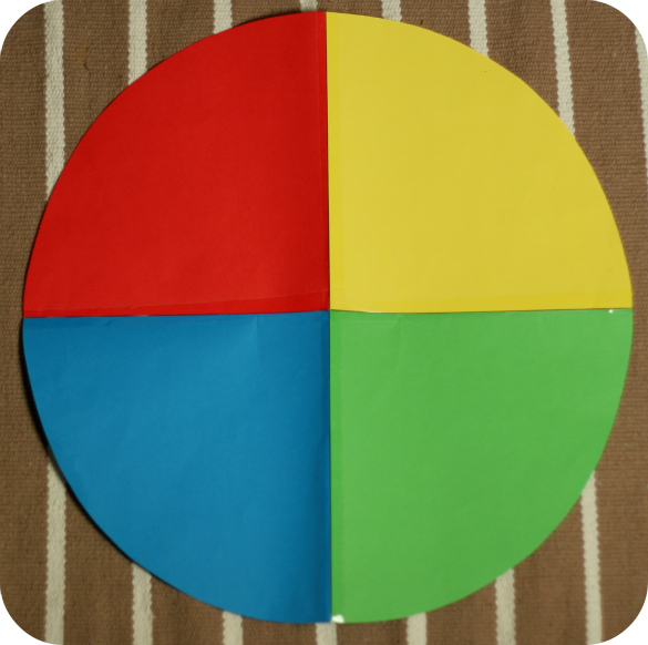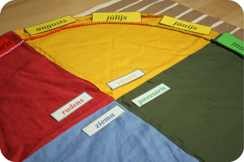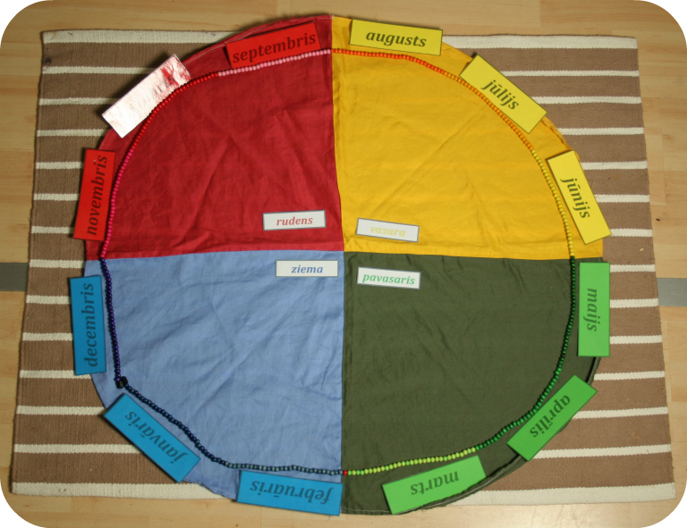 Tas sastāv no 4 krāsām un katra krāsa reprezentē savu gadalaiku. Zilā – ziemu, zaļā – pavasari, dzeltenā – vasaru un sarkanā – rudeni. Šis materiāls tiek izmantots kopā ar vairāk kā 2 metrus garo Gada ķēdi (par to varēsi lasīt nākamajā bloga ierakstā), bet mēs sākumā strādājām ar gadalaiku apli, kas bija izveidots tikai no četrām A4 lapām. Tagad mums ir aplis, kas ir uzšūts no auduma, un tas ir krietni lielāks kā mūsu papīra aplis.