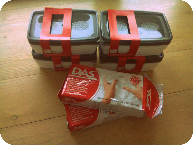 Veikalā RIMI iegādājāmies šādus trauciņus un veidošanas masu (lai izgatavotu šo materiālu mums bija nepieciešams mazliet vairāk kā viens šāds veidošanas masas iepakojums). Veidošanas masas ir nopērkamas arī brūnā krāsā, tāpēc ieteiktu pirkt tādu, lai nav tik daudz darba jāiegulda materiāla tapšanā.