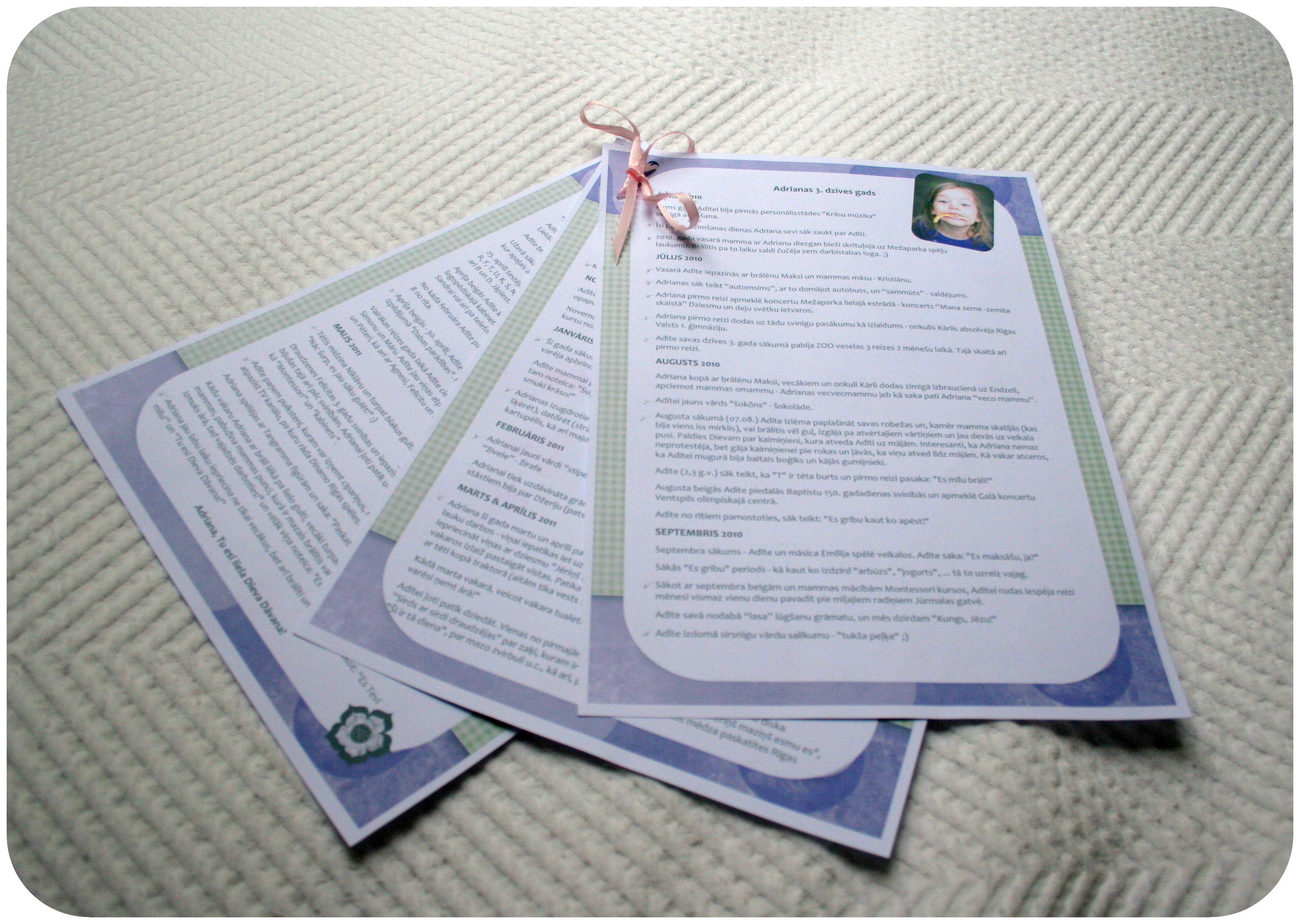 Vairākos bloga ierakstos esmu atsaukusies uz grāmatu “How To Raise An Amazing Child the Montessori Way”. Man ļoti iepatikās tajā aprakstītā ideja par “Laika kapsulu”, kuru arī īstenoju uz Adrianas 3. dzimšanas dienu.