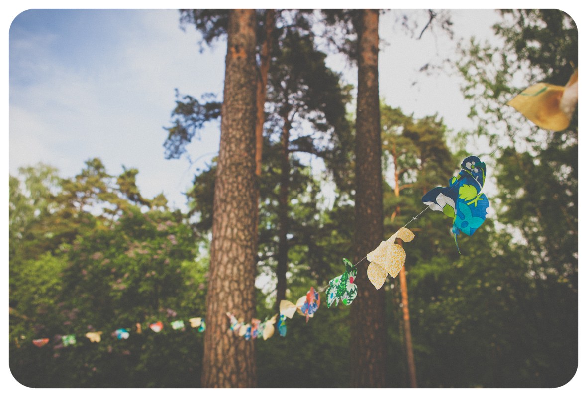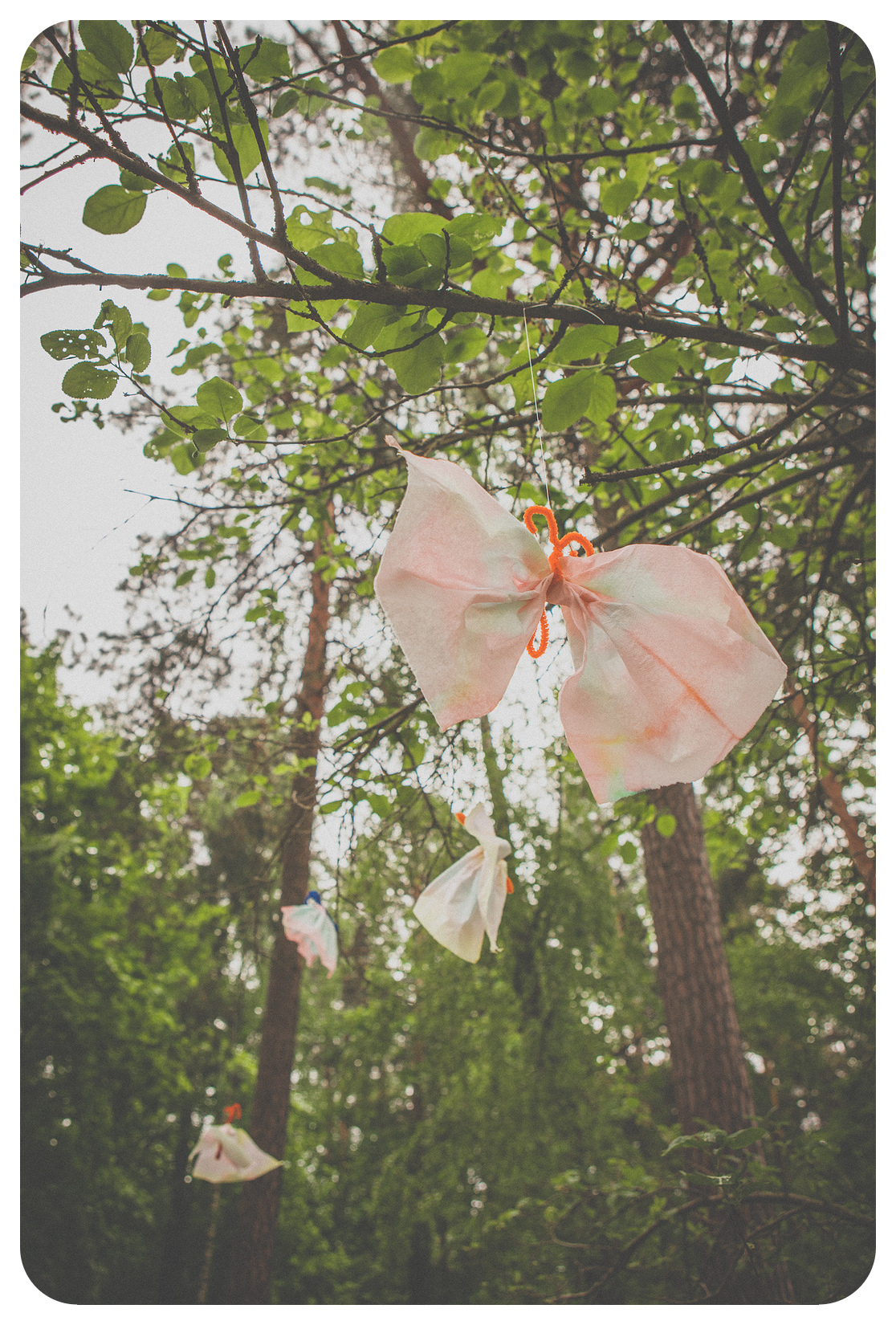 Dārzu dekorējām ar auduma taurenīšu virteni (iedvesmu smēlos šeit) un taureņiem, kas gatavoti, papīra dvieli iemērcot pārtikas krāsvielā. Ideju ieraudzīju šeit.