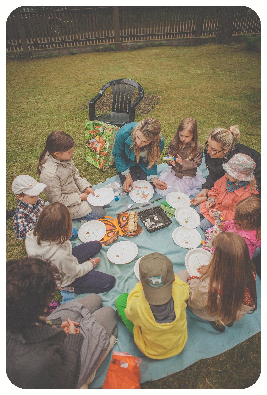 Uz papīra šķīvjiem ar plāksteru palīdzību to arī attēlojām – ola, kāpurs, kūniņa un taurenis.