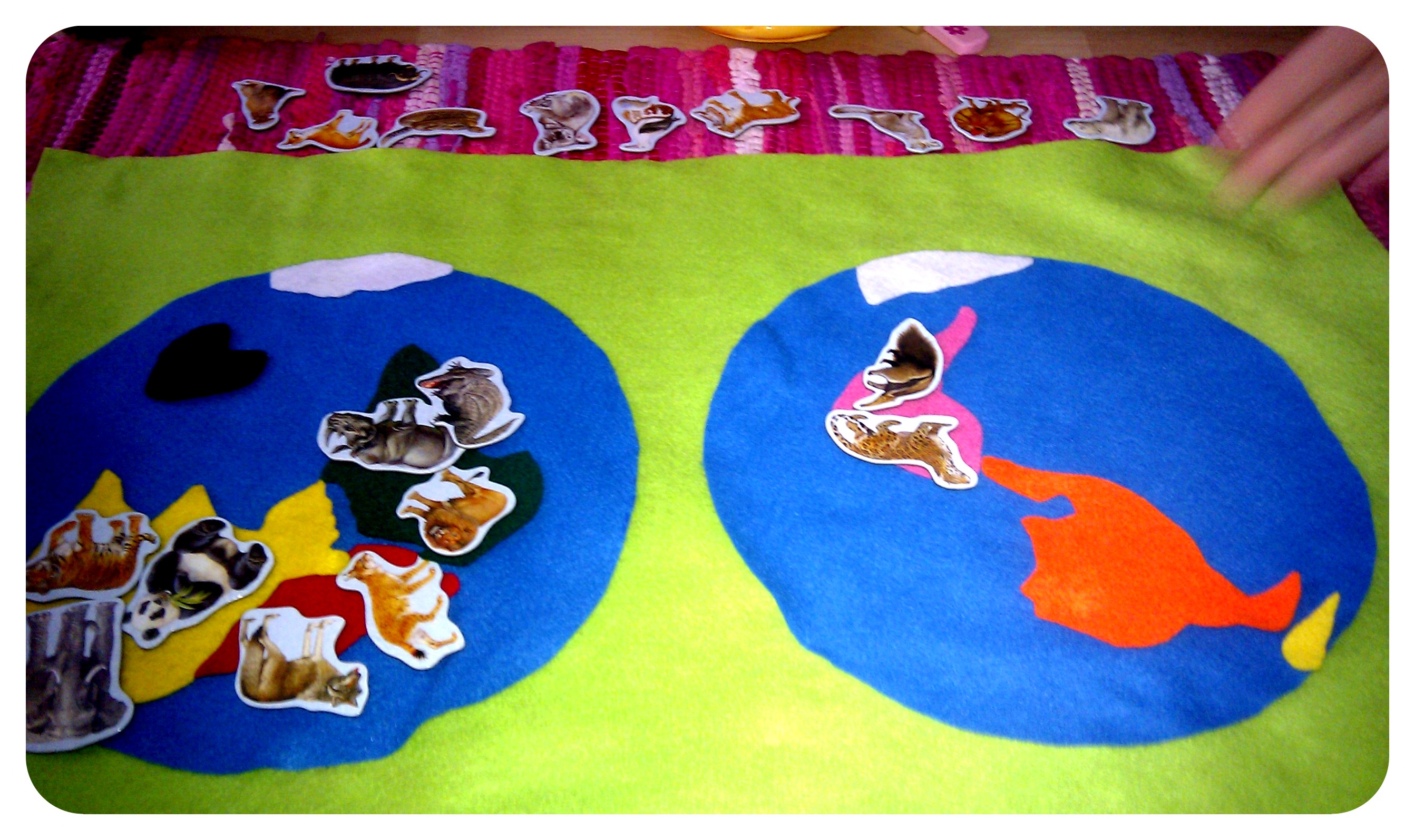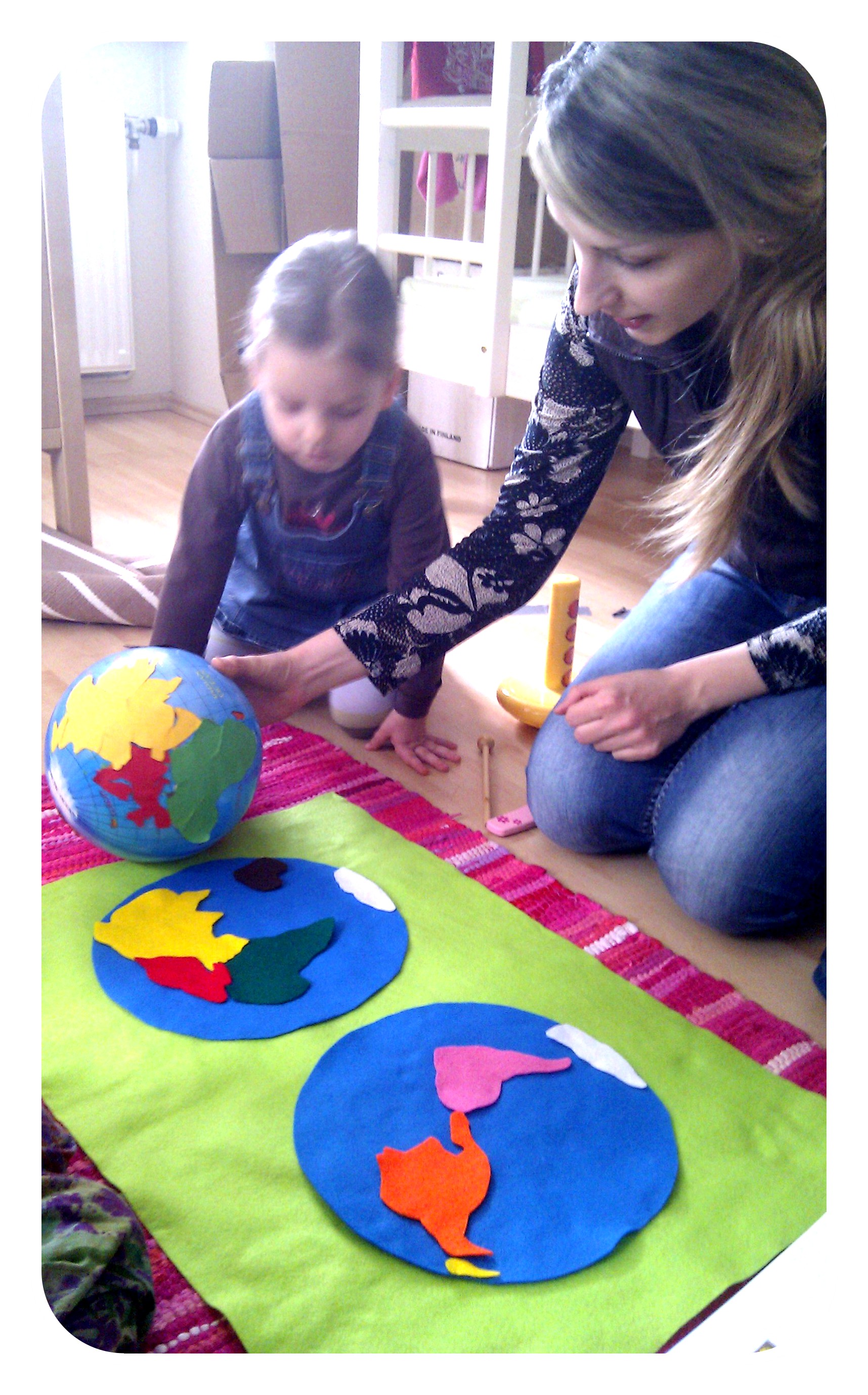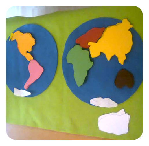 Kādā no nākamajām dienām kopā ar bērniem pagatavojām paši savus kontinentu globusus, ņemot zilus balonus un kontinentus, kas izgriezti no tādas pašas krāsas papīra, kā pusložu kartes puzlē. Galarezultās izskatījās šāds.
