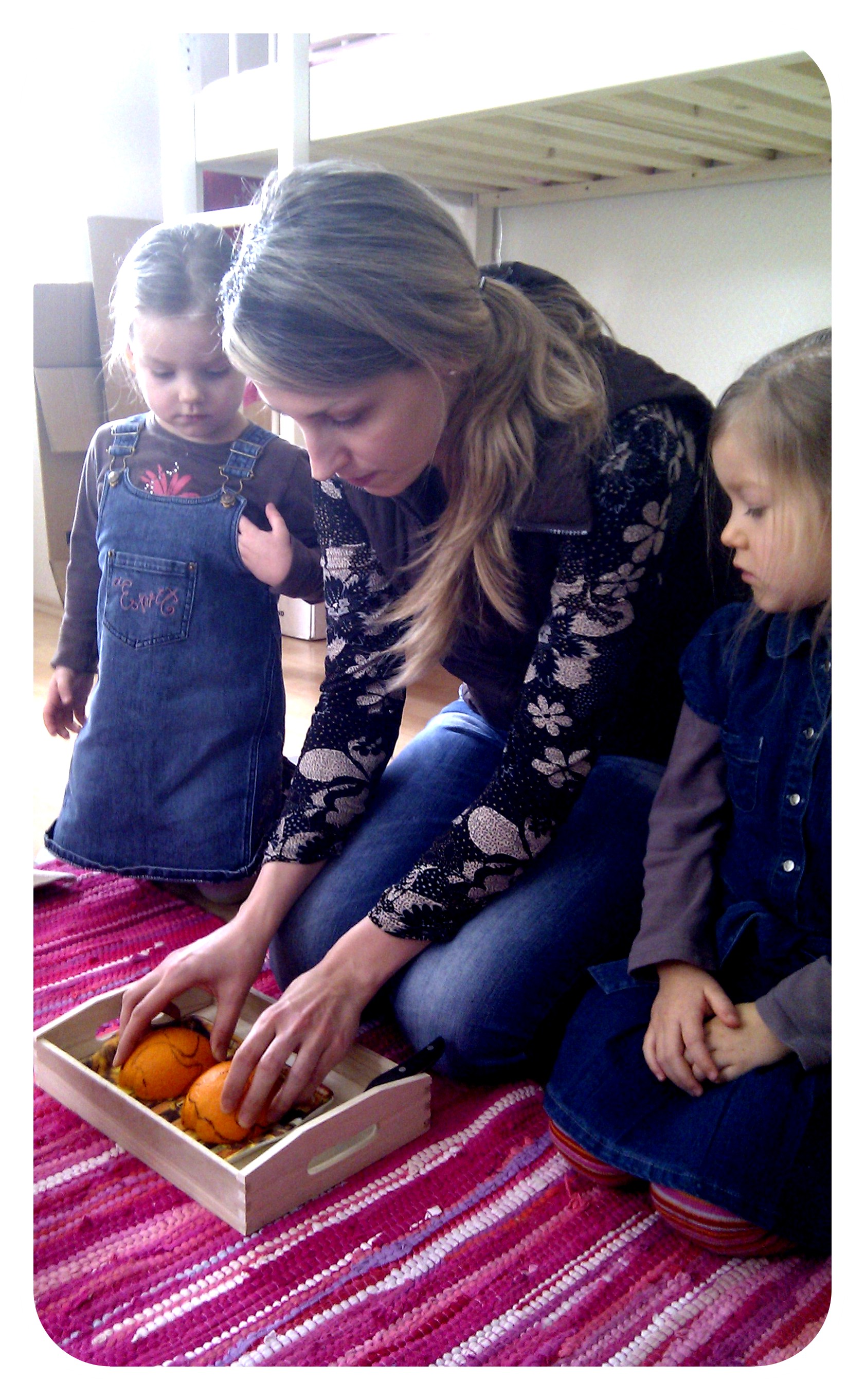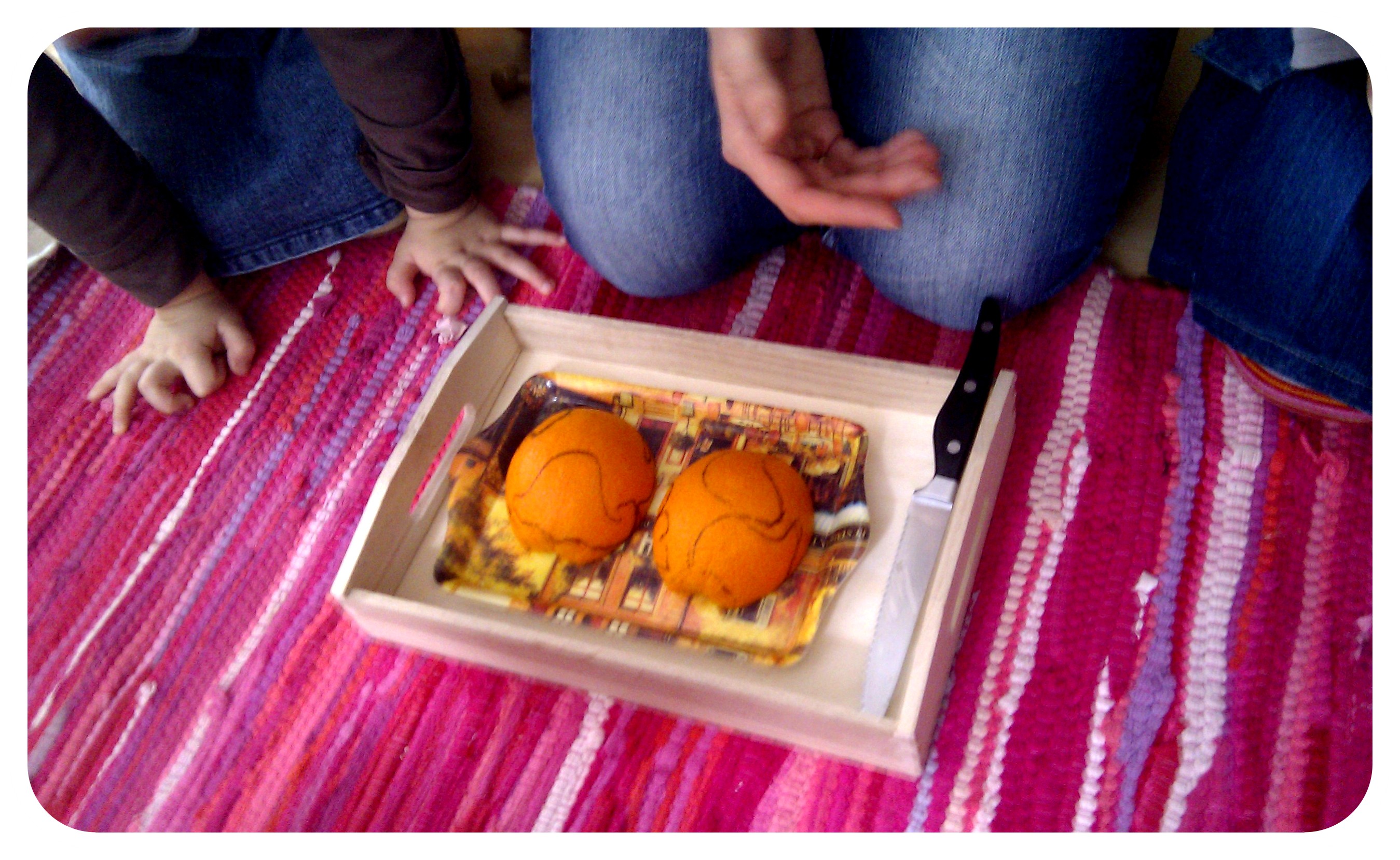 Tad turpinājām darbu ar pusložu kartes puzli. Paņēmu apelsīnu un uz tā ar permanento flomāsteru uzzīmēju kontinentu kontūras. Parādīju bērniem, ka arī man ir kaut kas līdzīgs Zemei, pieliku apelsīnu blakus Zanes bumbai.