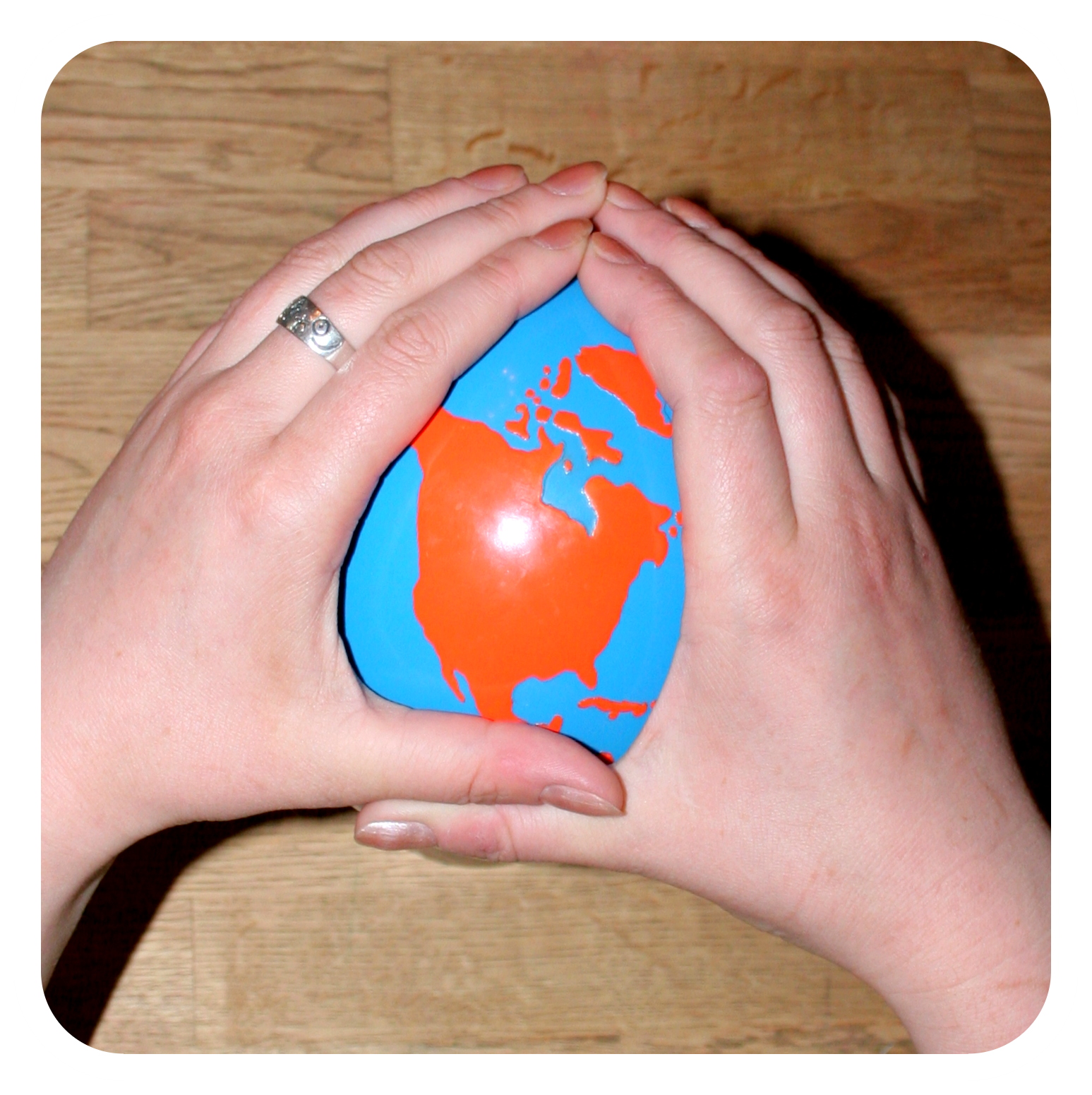 Kontinentu globusu Zane uztaisīja, par pamatu ņemot veikalā nopērkamu bumbu (zemāk rakstā vienā no bildēm varēsi to redzēt). Ar tās palīdzību iepazīstinājām bērnus ar jaunajiem jēdziniem – kontinents un okeāns. To dara šādi – rokas saliek kopā tā, lai izveidotos rombs un tad to uzliek virsū attiecīgi vai nu uz kāda no kontinentiem vai okeāniem.