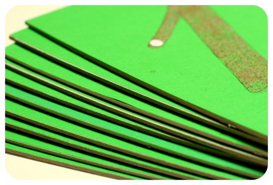 4. Pielīmē zaļo ciparu uz kartonu un paliek zem “preses” (kādām smagākām grāmatām, lai nospiežas – labāk salīmējas).