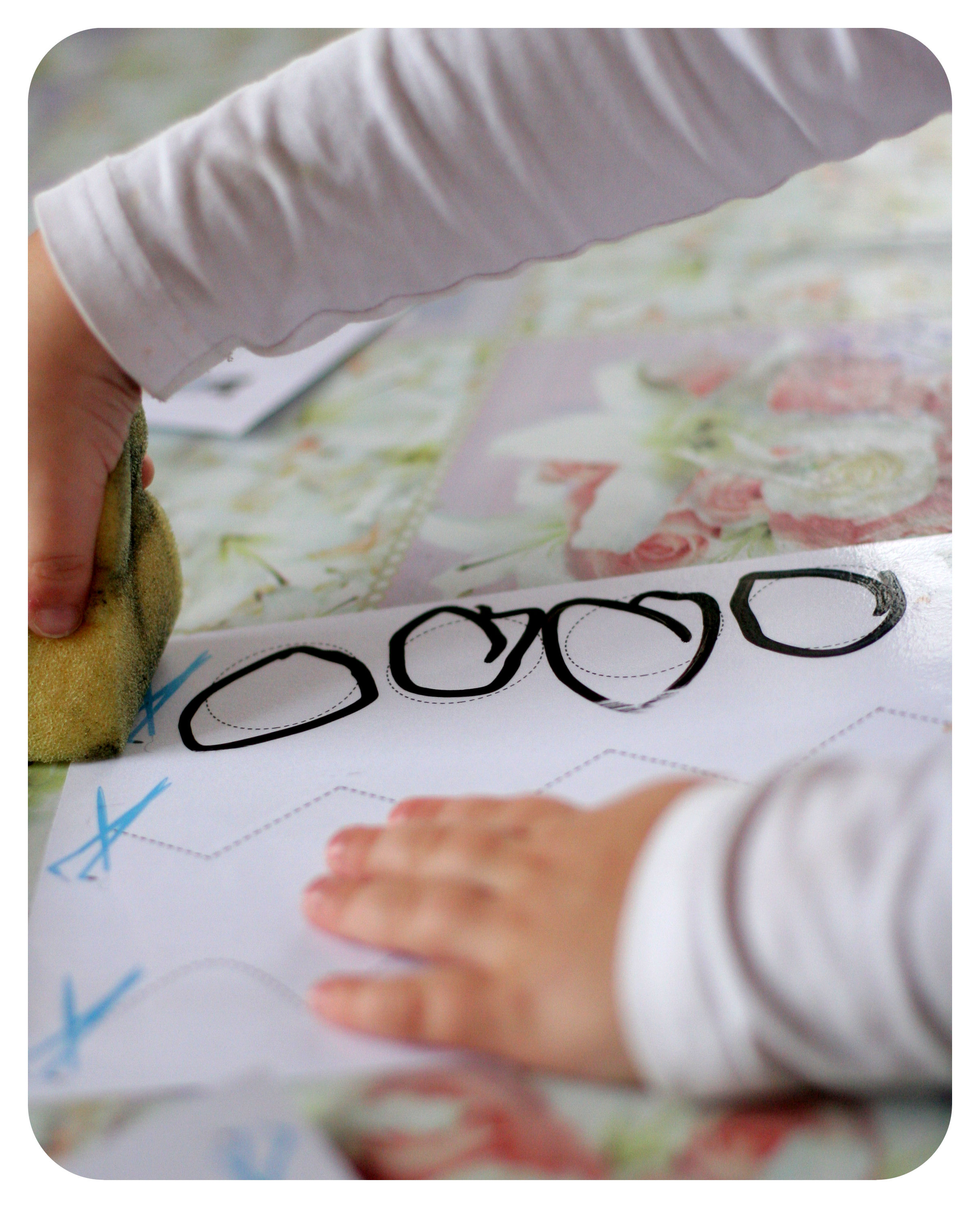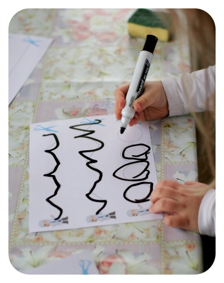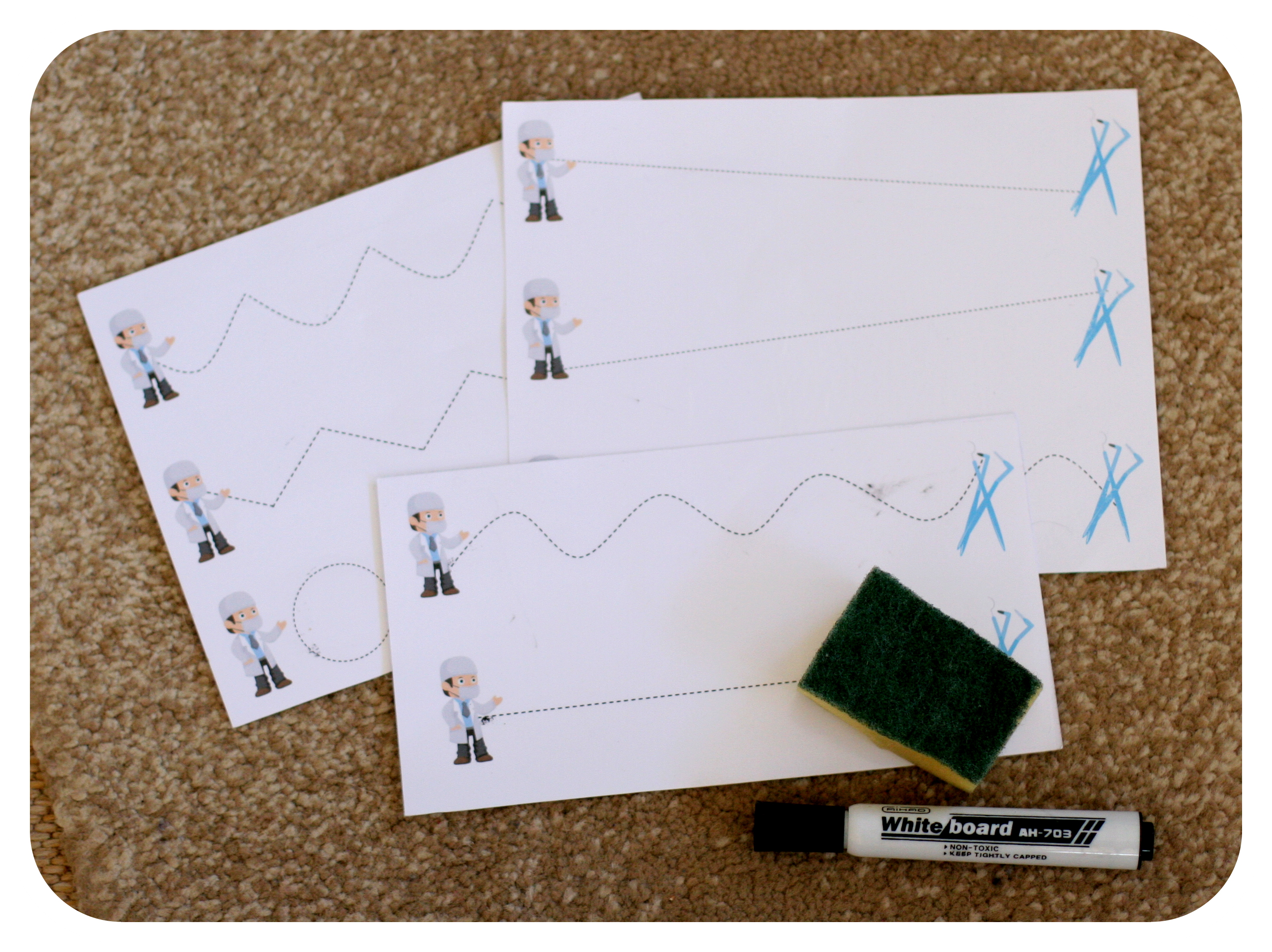 * Diezgan iecienīta nodarbošanās bija zīmēšana ar baltās tāfeles flomāsteru. Blogā “2 Teaching Mommies”  ir pieejama uzdevumu paka par zobārsta tēmu un tajā ir arī uzdevumi, kas saistīti ar rakstīšanu. Es tos izdrukāju un pārklāju ar caurspīdīgo līmplēvi (ja Tev ir laminētājs, tad uzdevumus varētu arī ielaminēt). Konkrēti šeit bija uzdevums palīdzēt zobārstam tikt līdz darba instrumentiem.