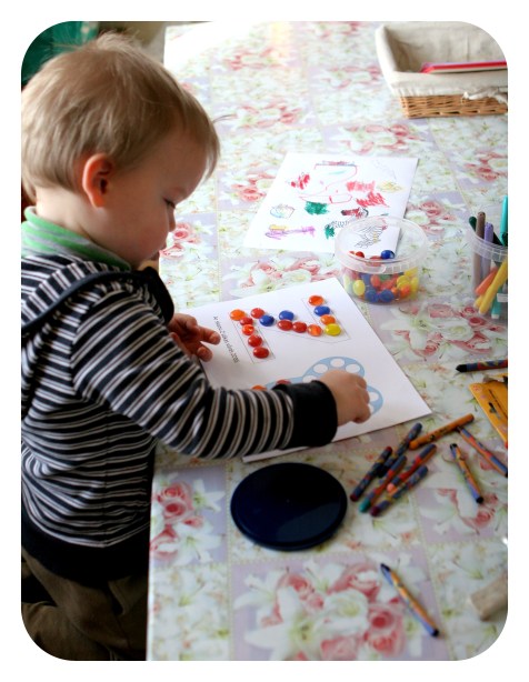 Bērns var šos aplīšus ar flomāsteru izkrāsot. Taču kādā vietā redzēju, ka uz aplīšiem var likt bumbiņveidīgus priekšmetus. Tad nu ņēmām mūsu stikla akmentiņus (pēc formas līdzīgus puslodēm) un likām uz baltajiem aplīšiem. Bērniem šī nodarbe patiešām patika.