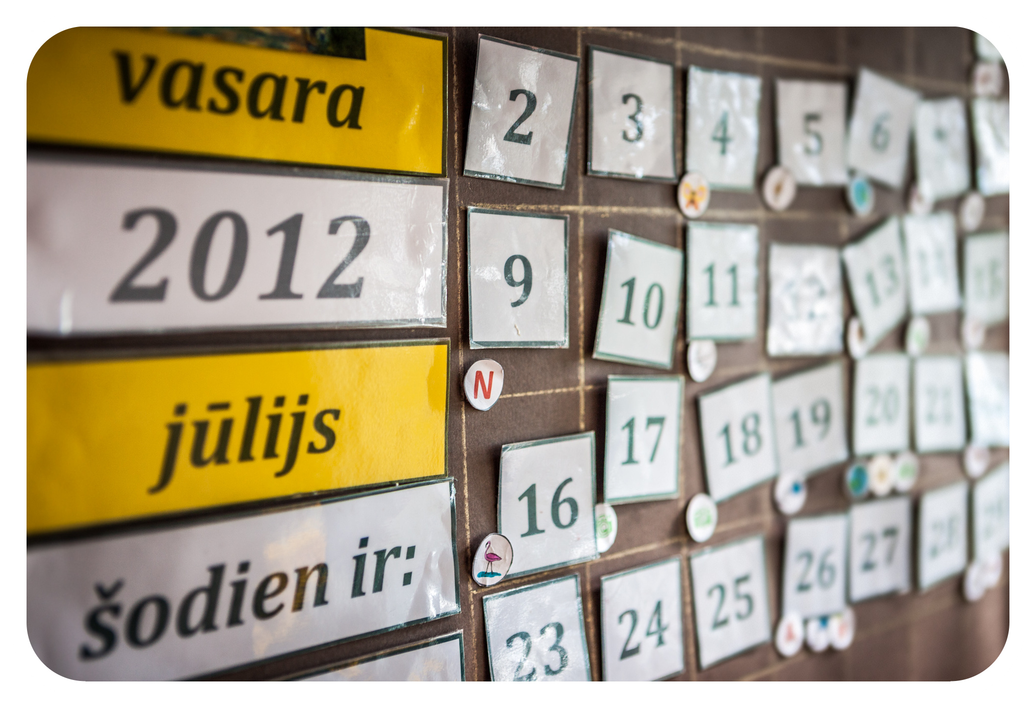 • Bērniem patīk kalendārā atzīmēt svarīgākos mēneša notikumus (mazas piktogrammas riņķa formā), piem., braucienu uz baznīcu, braucienus uz Montessori kabinetu/bērnu māju, kādu semināru, tēta darba dienas (kad jābrauc fotogrāfēt), mūsu ZOO dienas (piem., ar žirafes attēlu), jubilejas, ciemošanos pie vecvecākiem, “Spēlēsim skolu” dienas, u.c. svarīgām lietām. Īpaši esam atzīmējuši arī katra bērna mēneša jubileju datumus (mums tie ir 9., 20. un 26. datums), lai tajā dienā konkrētais bērns dzīves ķēdē uzvērtu pērli. Par dzīves ķēdi vari izlasīt Ilzes blogā. Šī ideja man arī ļoti patīk.