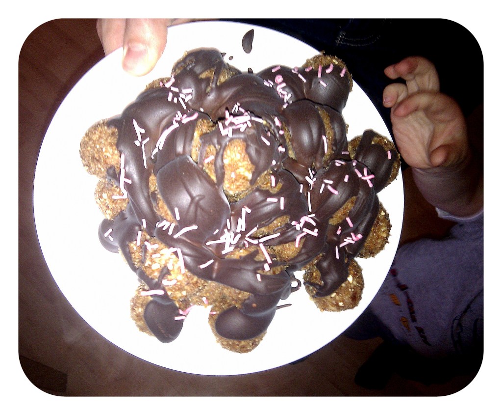 un Evelīna mēģināja atdarināt veikalā nopērkamos saldos skudru pūžņus, pagatavojot tos gandrīz vai svaigēdājstilā (tikai kausētā šokolāde un rozā skaidiņas (jeb skudriņas) nebija “svaigas”). Paši skudru pūžņi sanāca ļoti “neasi” (bildē), tāpēc parādīšu kāds izskatījās “Saldais skudru pūznis 2” – tās bija svaigās trifeles ar šokolādes glazūru un