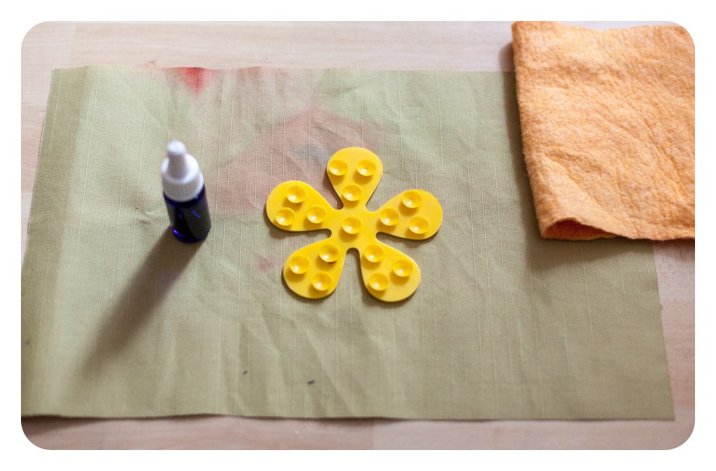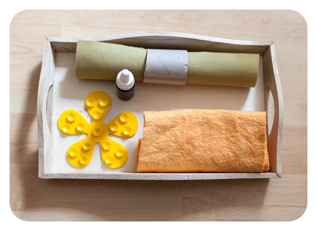 Zemāk ir redzams viss, kas nepieciešams uzdevuma veikšanai: puķīte, pipete ar iekrāsotu ūdeni (es iekrāsoju ar pārtikas krāsvielu, bet varētu arī ar akvareļkrāsām vai vispār nekrāsot), paliktnis/vaska drāna un lupatiņa. Ūdeni iekrāsoju, lai bērns uzskatāmāk redzētu, kā iedobīte aizpildās un pipete paliek tukša.