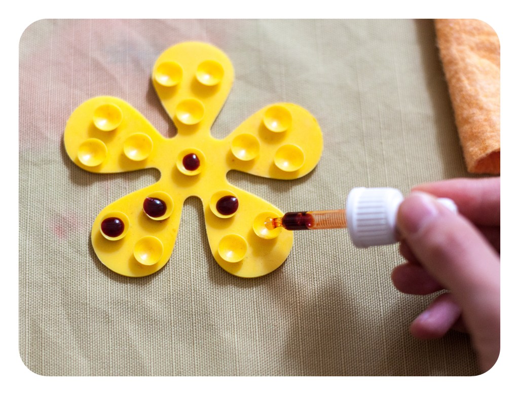 Uzdevums ir ar pipeti un iekrāsotu ūdeni aizpildīt tam paredzētas iedobītes “puķītē”.