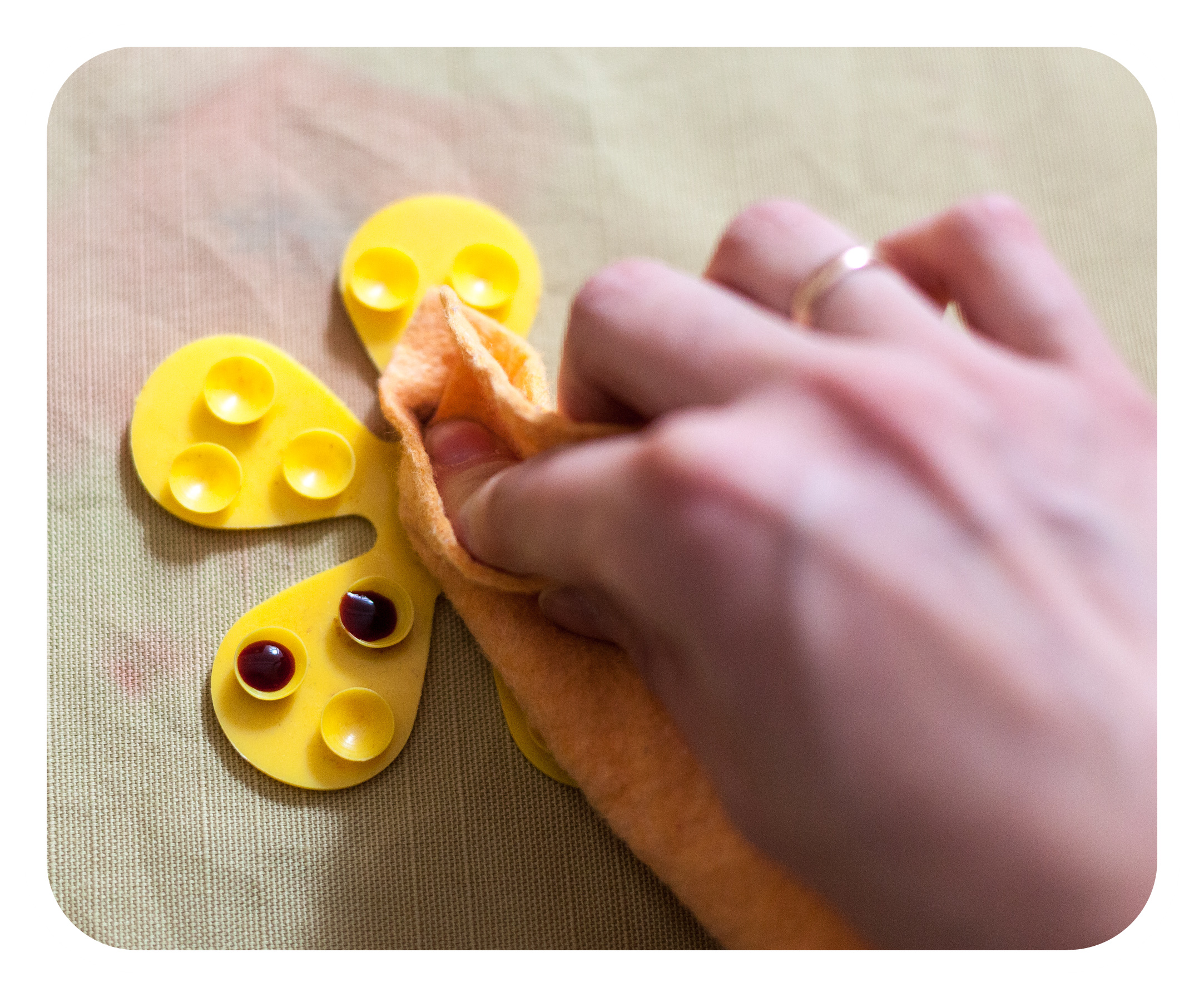 Tad, kad visas iedobītes ir aizpildītas (ļauj bērnam papriecāties par paveikto :)) un tad aicini viņu ar lupatiņu iedobītes izsusināt.