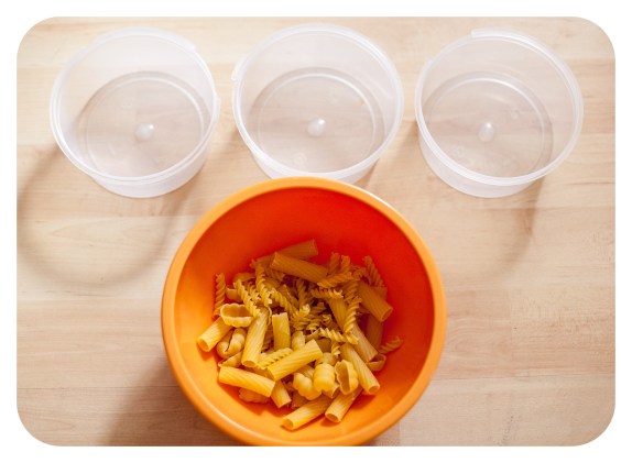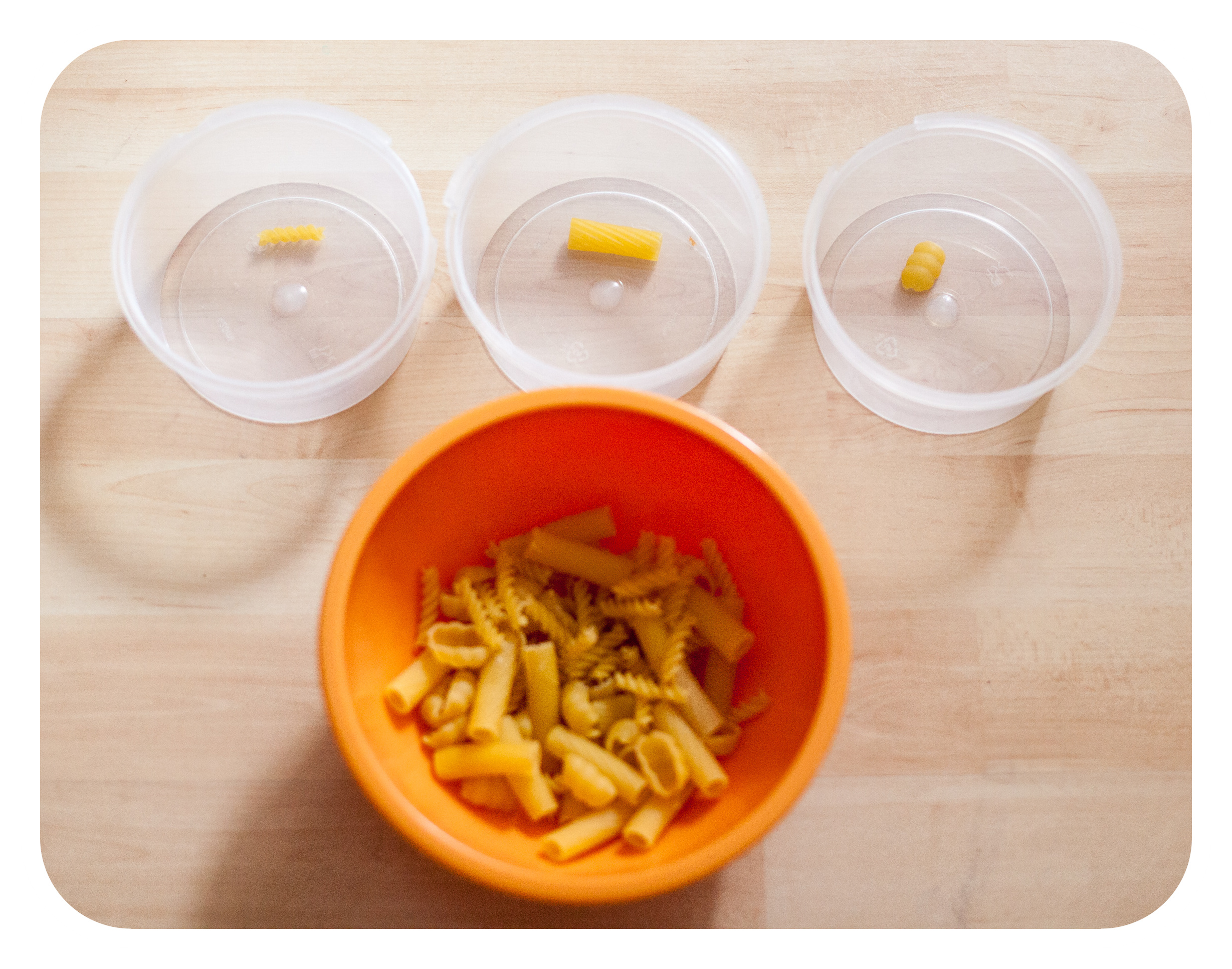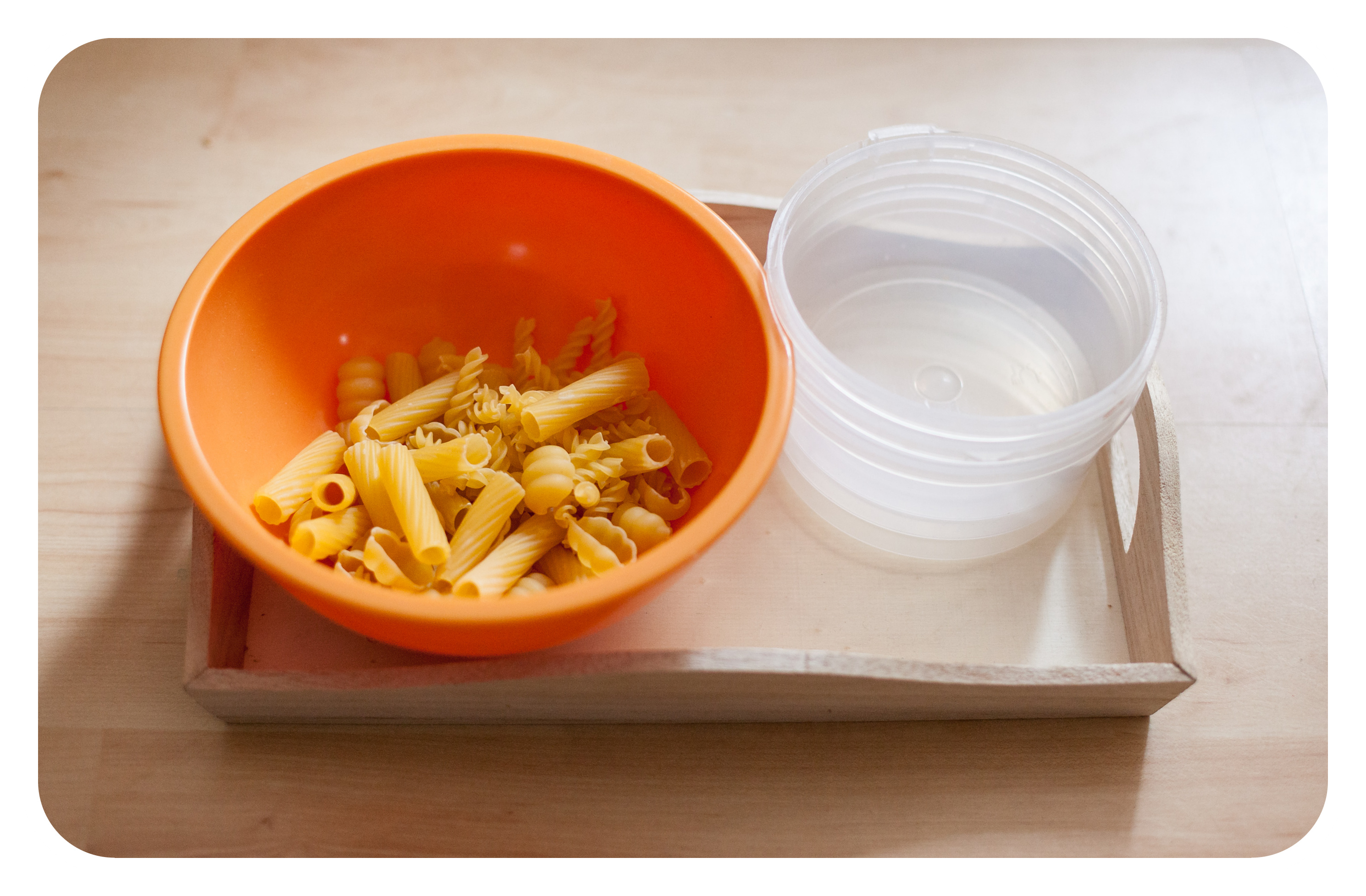 Šis būs makaronu šķirošanas vingrinājums. Makaronu vietā varētu būt pērlītes, gliemežvāki, LEGO klucīši, pogas, rudens veltes (piem., kastaņi, čiekuri un ozolzīles) vai kas cits, kas mājās atrodams. Tātad ir vajadzīgs šķirojamais materiāls un trauciņi, kuros to sašķirot. Šis ir Montessori iedvesmots praktiskās dzīves un sajūtu vingrinājums, kuru var piedāvāt bērnam ap 3 gadu vecumu.