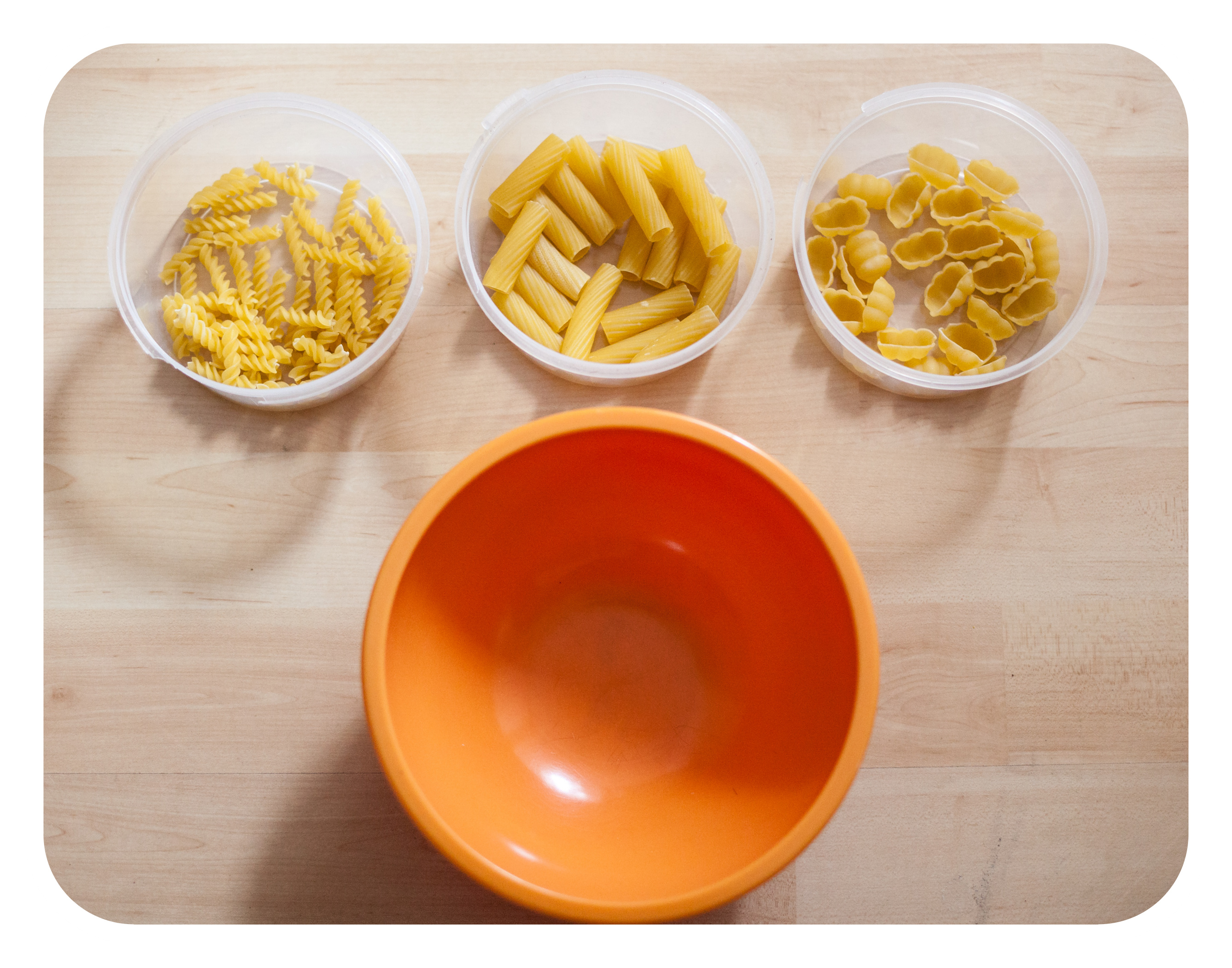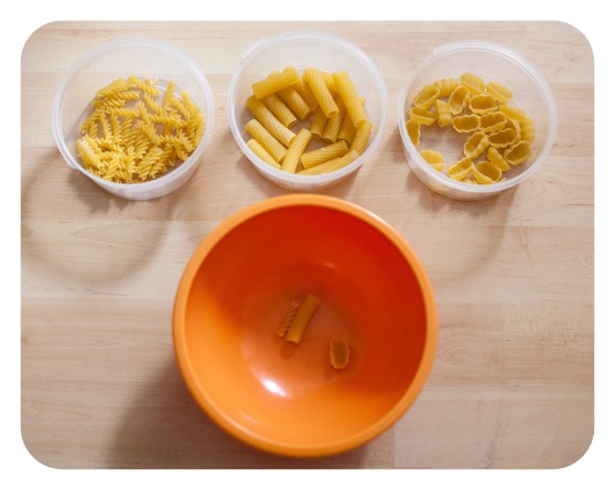 4. Visi makaroni ir lielajā bļodā un bērns pats nosaka kategorijas un sašķiro priekšmetus.