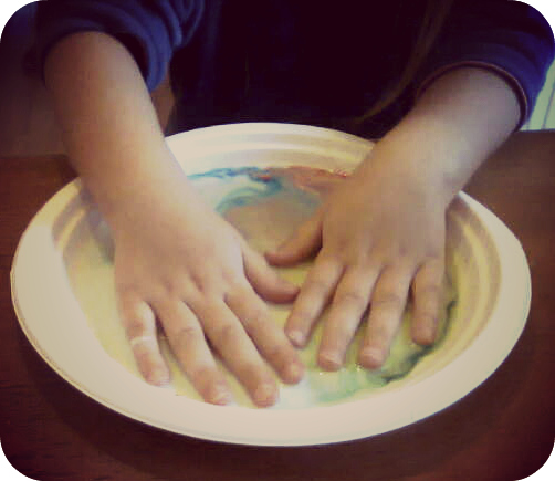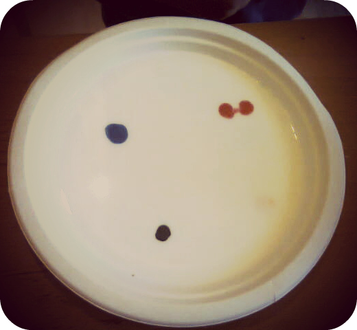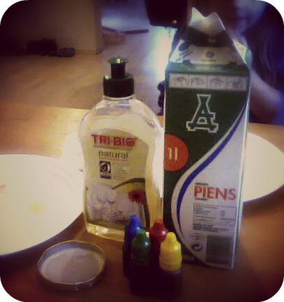 Traukā – uz šķīvja – tiek uzliets piens. Tad pienā iepilina mazliet pārtikas krāsvielas (pilināju vienu pilienu). Uz burciņas vāciņa (kas redzams augstāk attēlā) uzspiedu mazliet trauku mazgājamo līdzekli, lai bērni ar ausu tīrāmo kociņu tam labāk tiktu klāt.