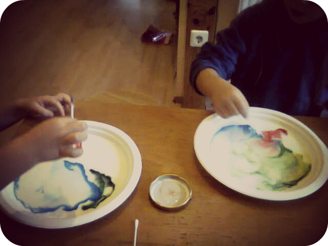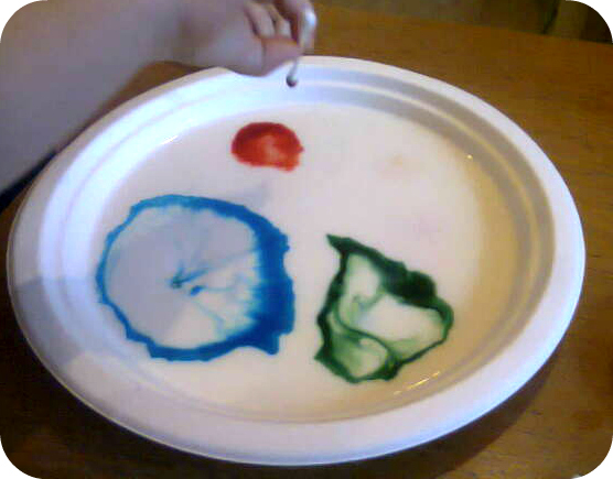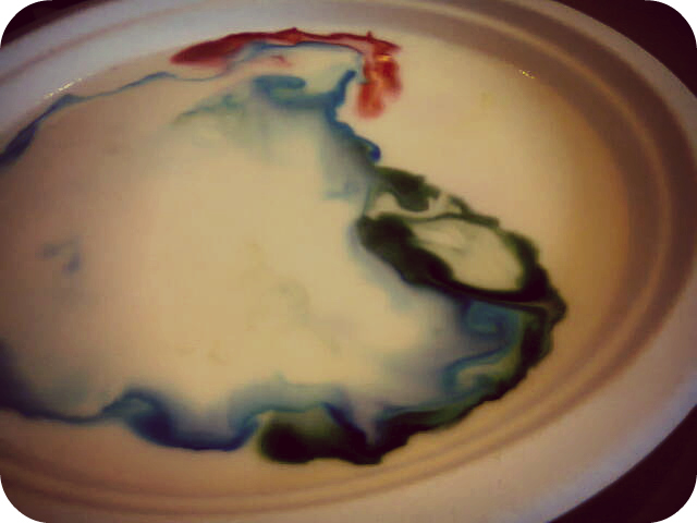Jau kādu laiku vēlējos ar bērniem uztaisīt eksperimentu ar pienu, kuru vairākos blogos biju redzējusi. Viendien pie brokastu galda to arī īstenojām (briedu, briedu un beidzot tam nobriedu, bet kā izrādījās, nevajadzēja nemaz tik ilgi gatavoties). Ja pie rokas ir piens, trauku mazgājamais līdzeklis, pārtikas krāsviela, kāds trauks (ne pārāk dziļš) un ausu tīrāmie kociņi, tad eksperiments var veiksmīgi noritēt un tas nebūt nav laikietilpīgs.