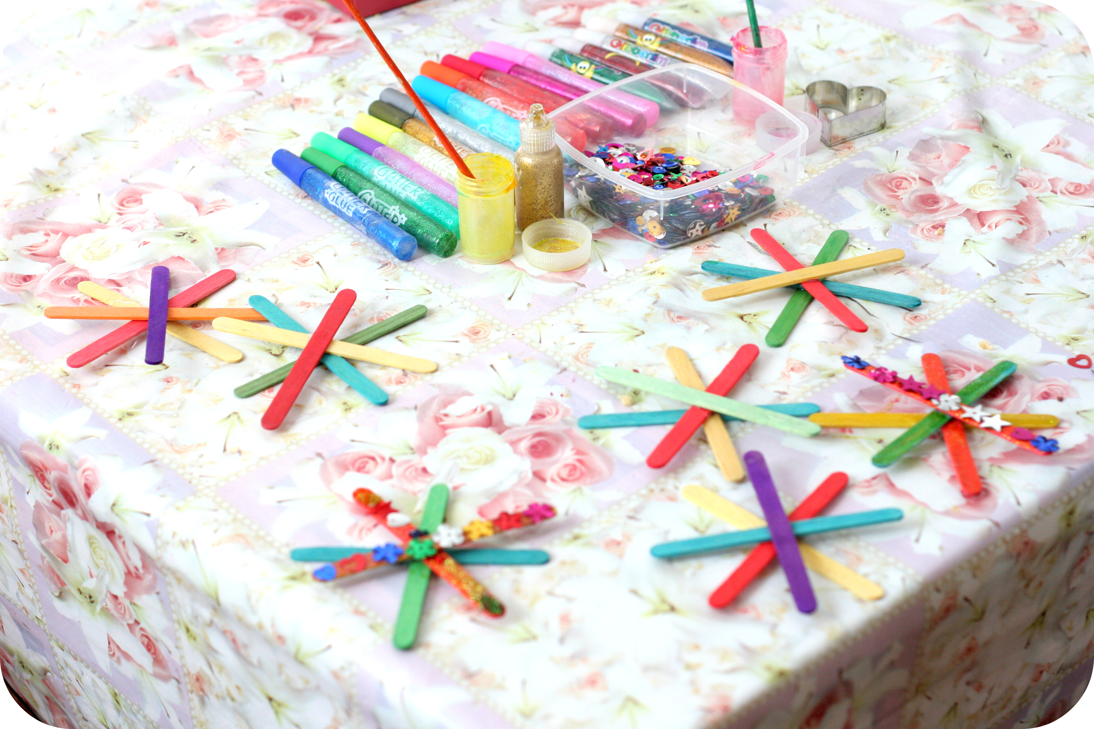 Un tad notika pārsliņu dekorēšana. Gliterlīmes (jeb līme ar spīgulīšiem) mums joprojām ir lielā cieņā. Ar tām tika noklātas pārsliņas un tad uz tām tika uzlīmēti fliteri. Pie šī darbiņa bērniem patika atkal un atkal atgriezties. Pirmajā dienā viņi izdekorēja vienu pārsliņu, bet tad nākamajā otro un trešo.