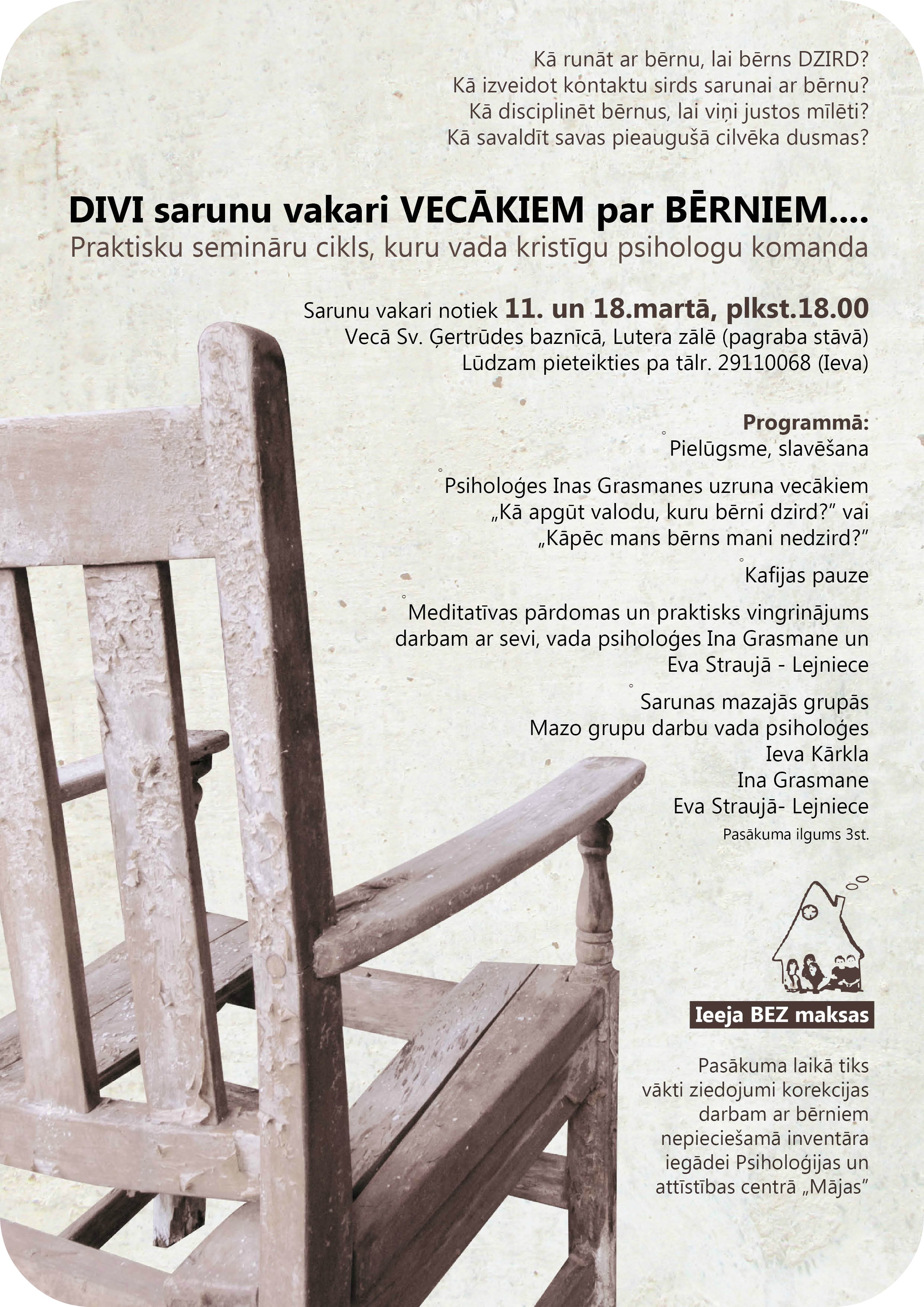 Gribu Tevi iepazīstināt ar lielisku iespēju apmeklēt praktisku semināru vecākiem “DIVI sarunu vakari VECĀKIEM par BĒRNIEM”. Seminārs būs par to, kā runāt ar bērnu, lai viņš dzirdētu; kā disciplinēt bērnu, lai viņš justos mīlēts; kā savaldīt savas pieaugušā cilvēka dusmas. Pirmā tikšanās jau pēc nedēļas – 11. martā. Seminārs ir bez maksas. Plakātā ir plašāka informācija par pasākumu.