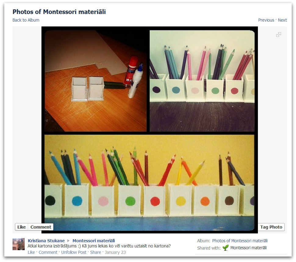 Jau pieminētajā “Montessori materiāli” Facebook grupā mammas parādījušas vairākas jaukas idejas par to, kā viņas kārto krāsainos zīmuļus. Zemāk pāris piemēri iedvesmai.