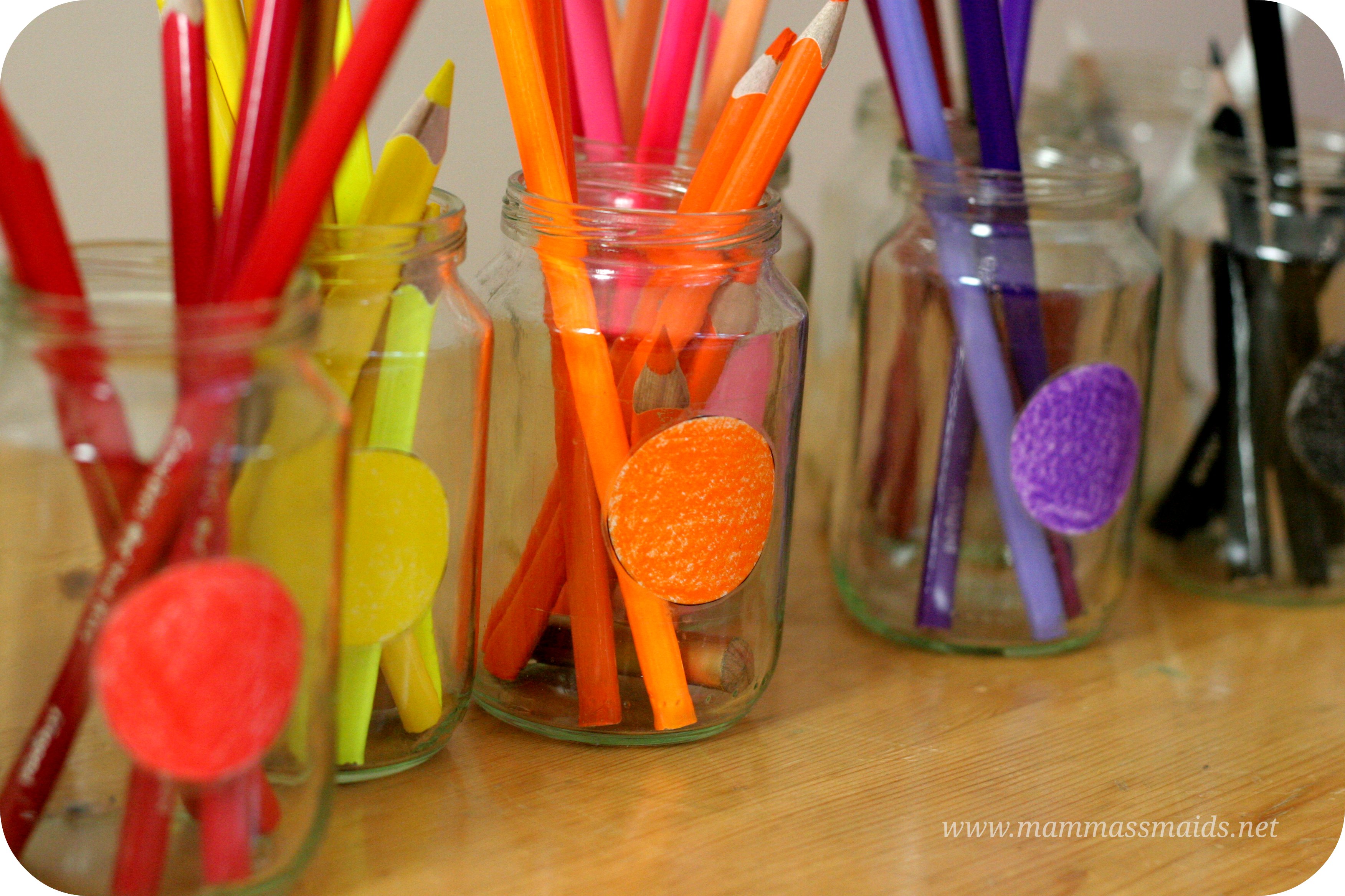 Šādi ir izkārtoti mūsu zīmuļi. Tie ir salikti bērnu biezenīšu burciņās, uz katras no burciņām ir uzlīmēts attiecīgās krāsas aplītis. Tos izdrukāju un pēc tam izkrāsoju, izgriezu un ar skoču/līmplēvi pielīmēju.
