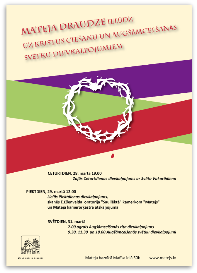 Ja šajā laikā ir vēlme aiziet uz baznīcu, tad Mateja baznīcā būs īpašs Zaļās ceturtdienas dievkalpojums, Lielajā piektdienā skanēs Ē. Ešenvalda oratorija “Saullēktā” un Lieldienās ir iespēja apmeklēt arī agro rīta dievkalpojumu – tas vienmēr ir ļoti īpašs un pacilājošs (pēdējos gados gan ar bērniem uz agro neesam vairs bijuši ;)).