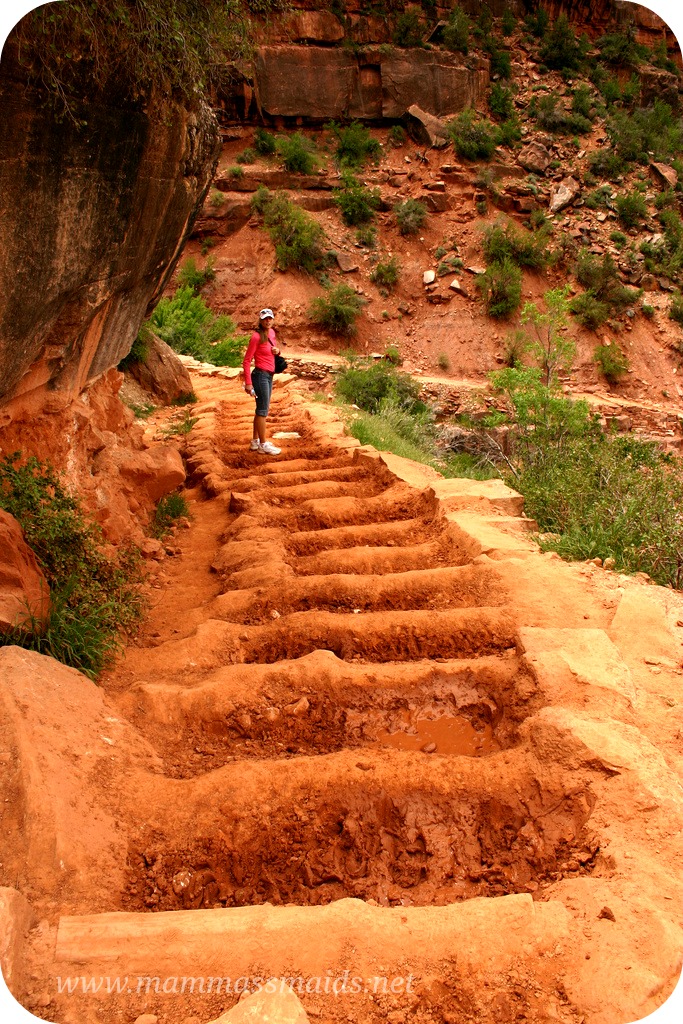 Ēnas jau kļuva garākas, un mēs beidzot nonācām līdz vietai, no kuras sākās mūsu ceļš augšup. Es jau pa ceļam biju paspējusi izdomāt, ka varētu mēģināt vīru pierunāt atpakaļ jāt uz mūļiem, bet kā vēlāk izrādījās, ar tiem var doties abos virzienos nevis tikai vienā. Kad uzsākām ceļu uz augšu, bija jau 7 vakarā, un kā mums teica parka reindžers, tad augšpuceļš mums prasītu kādas 2 stundas. Tā kā mums līdzi bija parka avīze, tad tajā varējām atrast arī autobusu sarakstu un, ja viss labi kārtotos, tad mēs paspētu uz pēdējo.