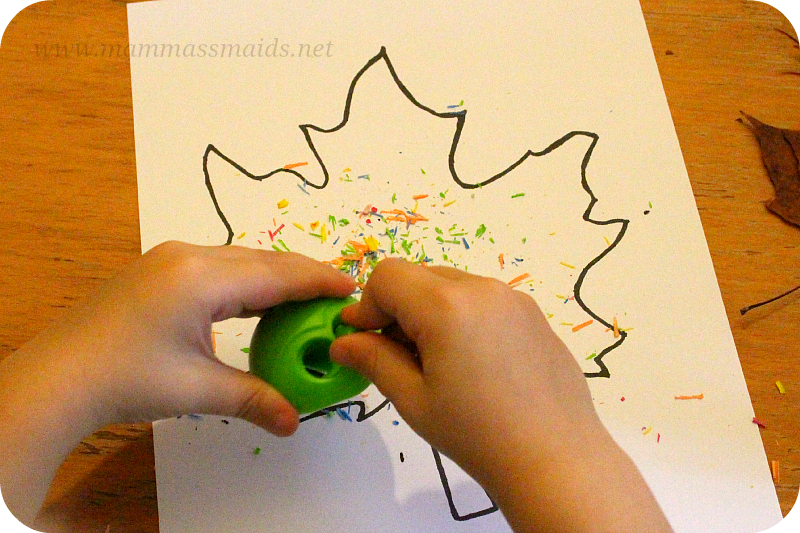 Bērns ar zīmuļu asināmā palīdzību asina vaska krītiņu un vaska krītiņa “skaidiņām” ļauj nokrist uz krāsojamās lapas.