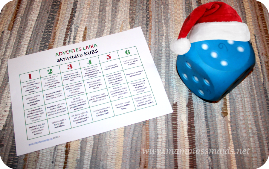 Pirms kāda laika internetā ieraudzīju šo Adventa laika aktivitāšu kubu un nodomāju, ka es šogad varētu ar saviem bērniem īstenot ko līdzīgu. Izveidoju tabuliņu un katrā no ailītēm ierakstīju kādu darbiņu. Vēlējos, lai šajā laikā bērni vairāk pastrādātu ar Montesori materiāliem, tāpēc aktivitātes ir saistītas ar vienu vai otru Montesori materiālu un tēmu, kas būtu vēl apgūstama/atkārtojama.