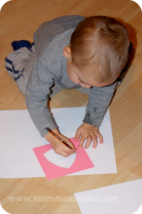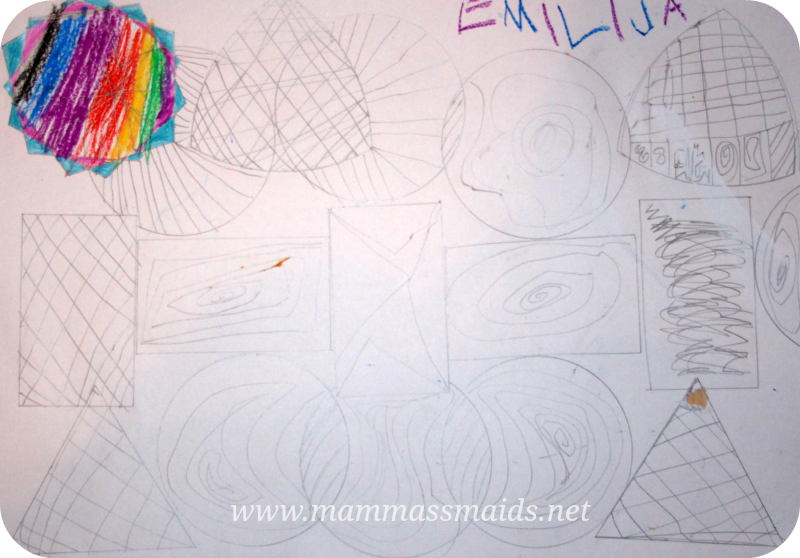 Bērni zīmēja uz grīdas. Uz paklājiņa izkārtoju metāla ieliktņus (ikdienā tie stāv uz paplātes un plauktā) un bērni varēja darboties ar zīmuļiem un eļļas krītiņiem.