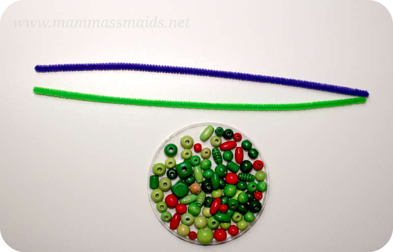 Lai pagatavotu šādas pārsliņas ir nepieciešamas pūkainās drātiņas un koka pērlītes.
