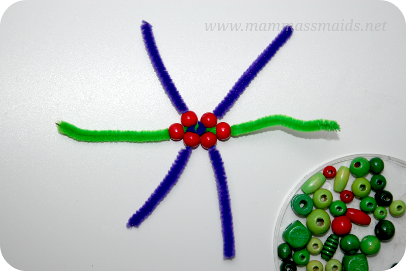Bērni, kuriem prāts uz pērlīšu vēršanu nenesās, varēja veidot šādu pārsliņu, izmantojot tikai pūkainās drātiņas.