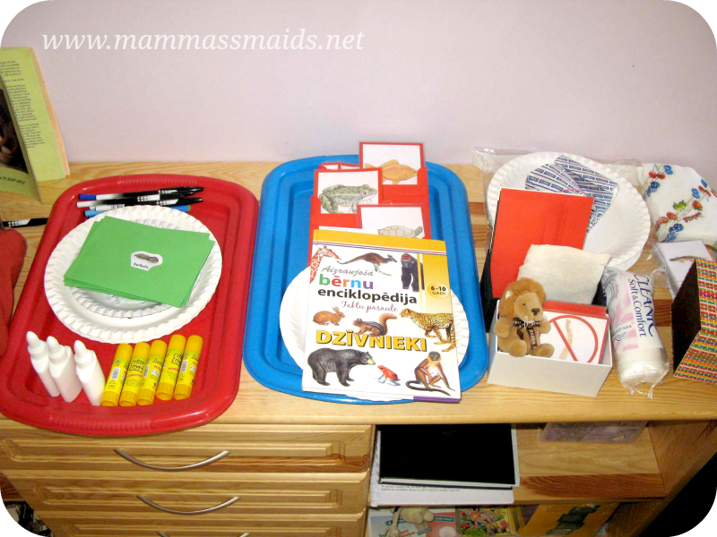 Zemāk var redzēt izliktos piecus šķīvjus,  uz kuriem sašķirojām dzīvniekus un bērnus strādājam ar zooloģijas puzlēm.