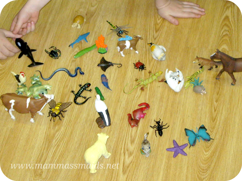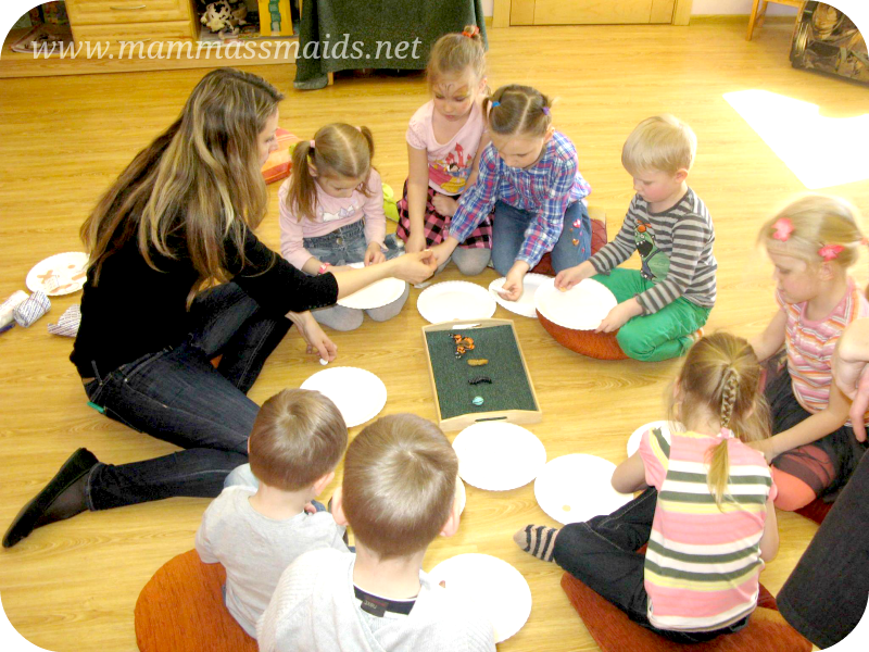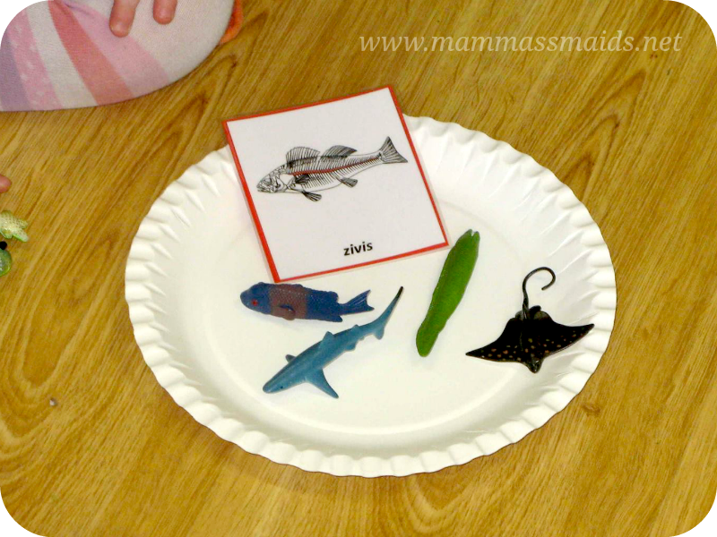Pastāstīju bērniem, ka visus dzīvniekus iedala bezmugurkaulniekos un mugurkaulniekos. Uz paplātes atsevišķi nolikām visus tos dzīvniekus, kuriem nav mugurkaula, piem., jūras zvaigzni, jūras zirdziņu, zirnekli un dažādus kukaiņus (taureni, biti, skudru, mārīti, spāri).