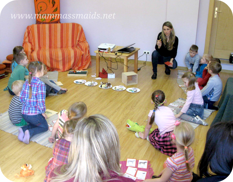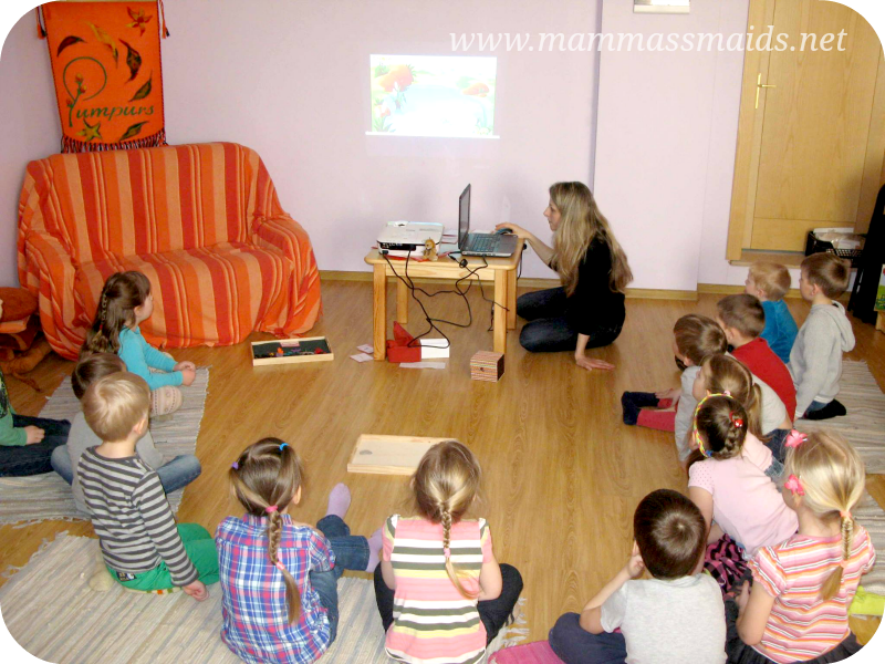 Gaidu bērnus un viss sagatavots nodarbībai. Lauviņa, kas sēž baltajā kastītē, man vienmēr brauc līdzi un grib iepazīties ar visiem bērniem.
