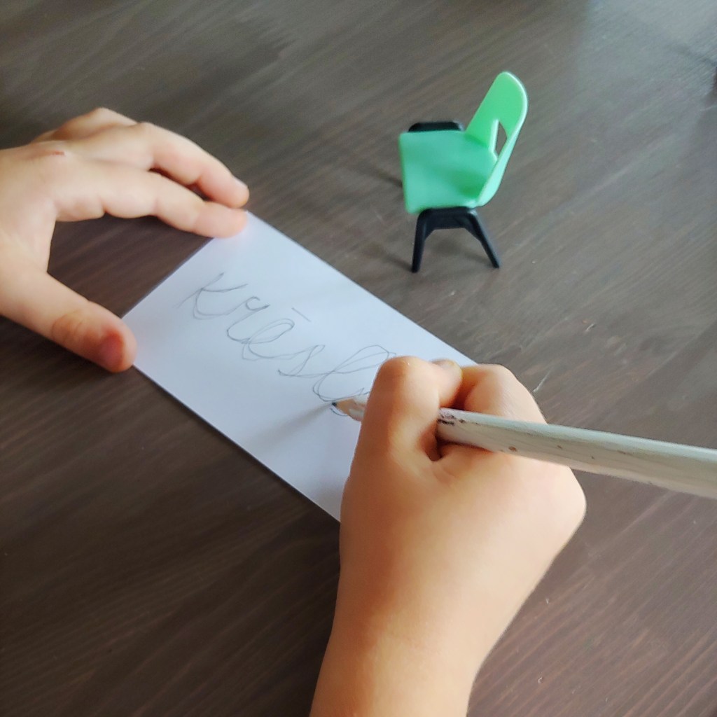 Pirmsskolnieks savukārt veica tādu kā mehāniskās pārrakstīšanas uzdevumu. Viņš izvēlējās priekšmetu, pateica, kas tas ir, es ar rakstītajiem burtiem (skaļi un lēni lasot) to uzrakstīju uz papīra, un tad viņš vārdu pārrakstīja.