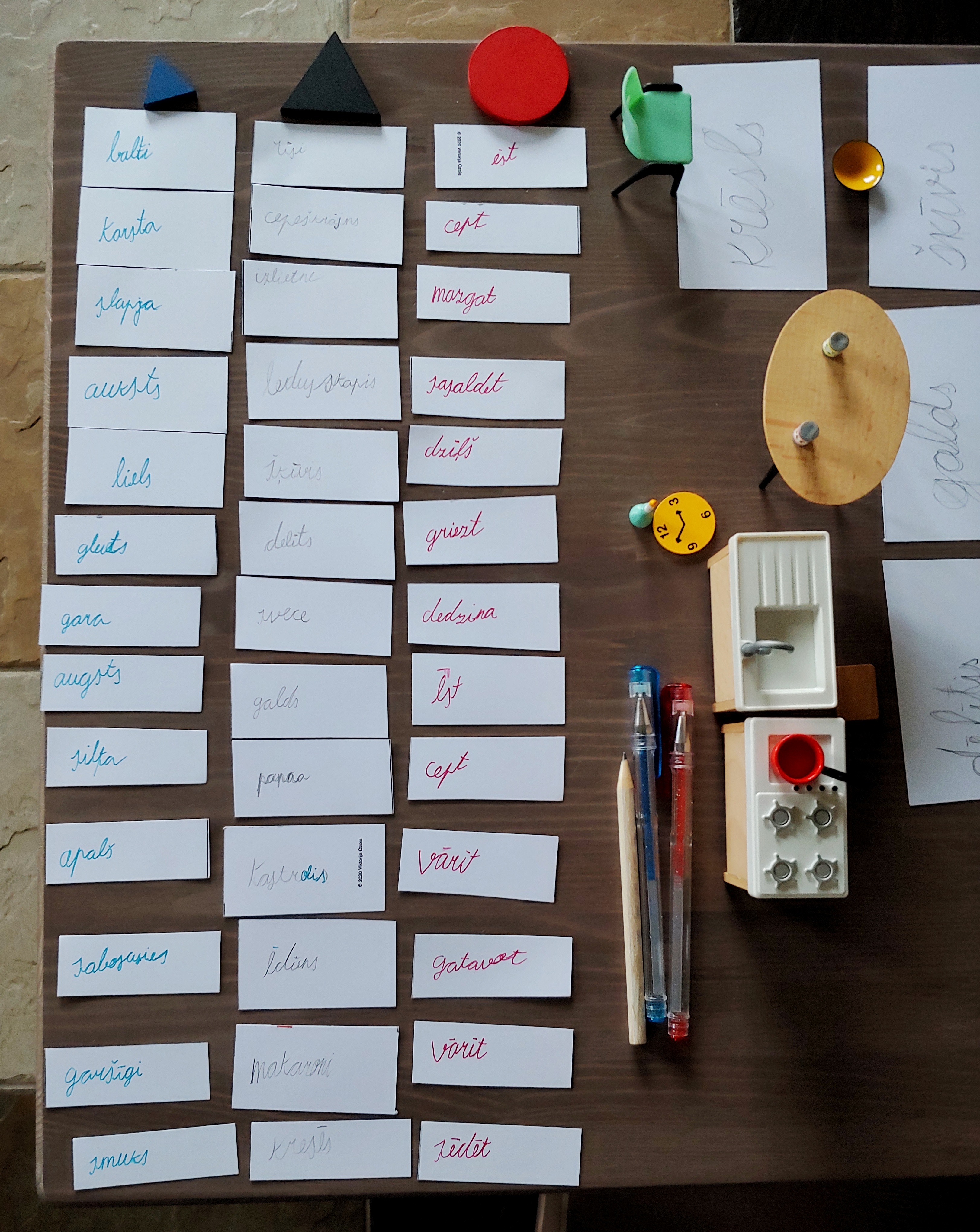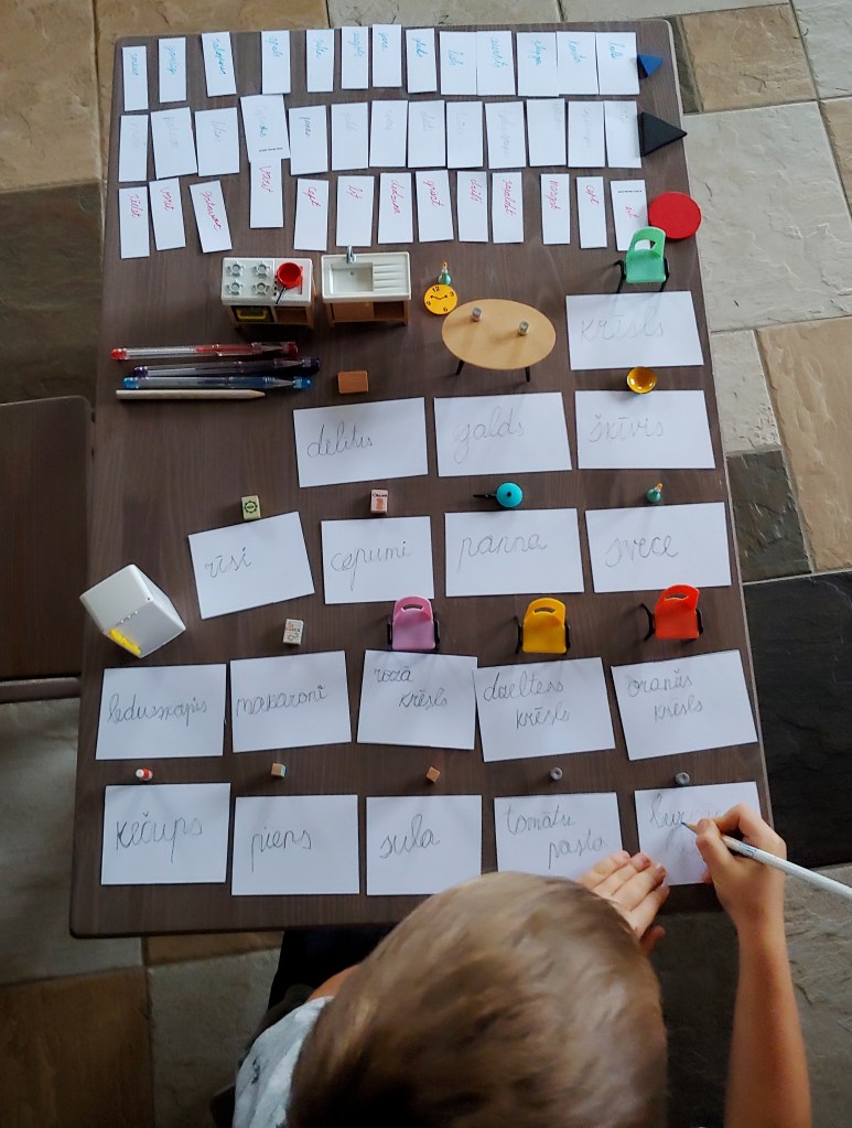 Skolniekam bija jāuzraksta visi iespējamie lietvārdi (pēc Montesori valodas materiāla lietvārdu apzīmē ar melnu trijstūri), kurus var atrast spēļu virtuvē un ēdamistabā (protams, to būtu bijis vairāk, bet – “beidzās” lapiņas un arī vieta uz galda 😂🙈😉). Pēc tam bija jāuzraksta lietvārdam atbilstošs īpašības vārds (apzīmē ar zilu trijstūri un bērns rakstīja ar zilu gēla pildspalvu, kas rakstīšanu padarīja vēl priecīgāku 😊). Un tad bija jāuzraksta, ko ar šo lietvārdu (priekšmetu no virtuves vai ēdamistabas) var darīt – tātad atbilstošs darbības vārds (apzīmē ar sarkanu apli).