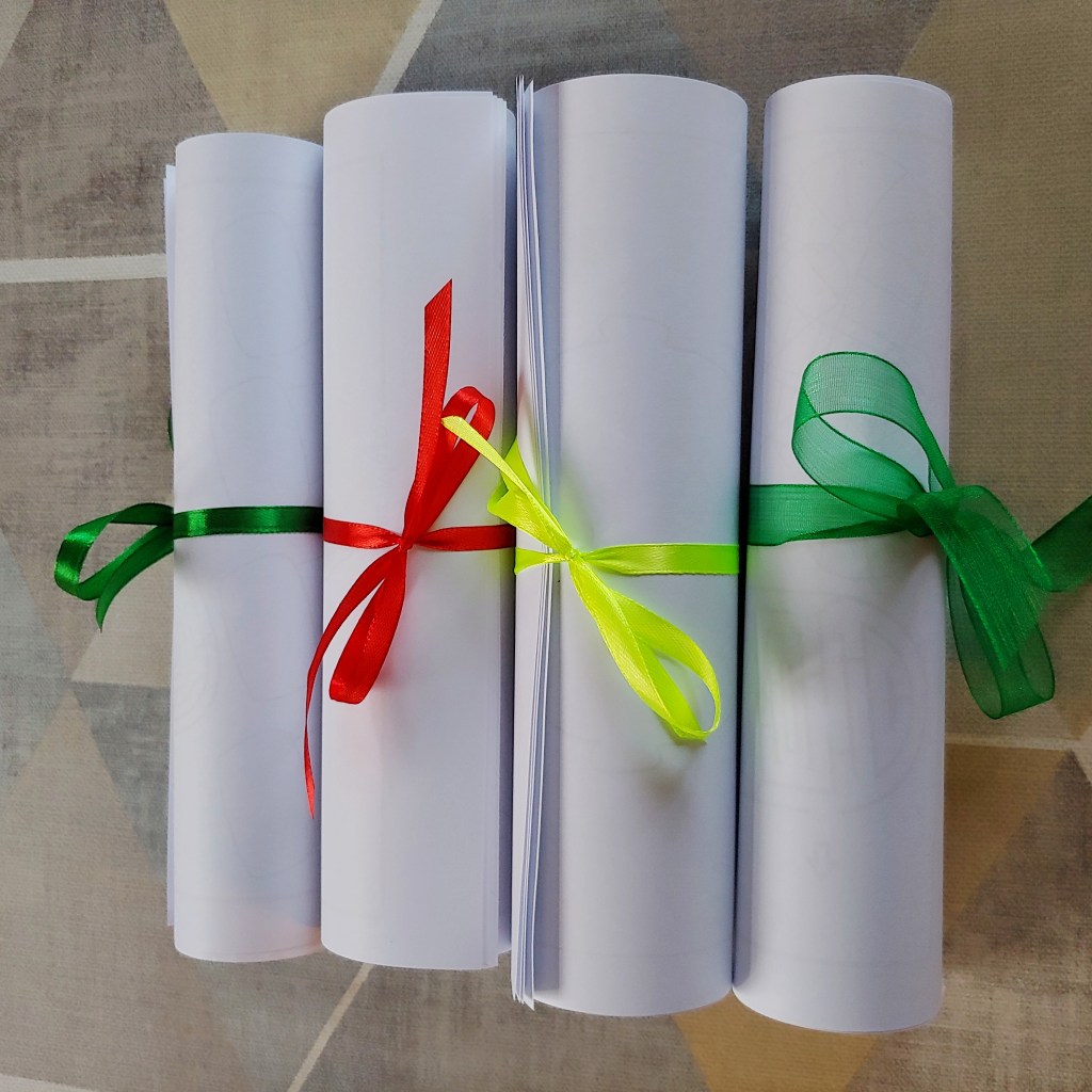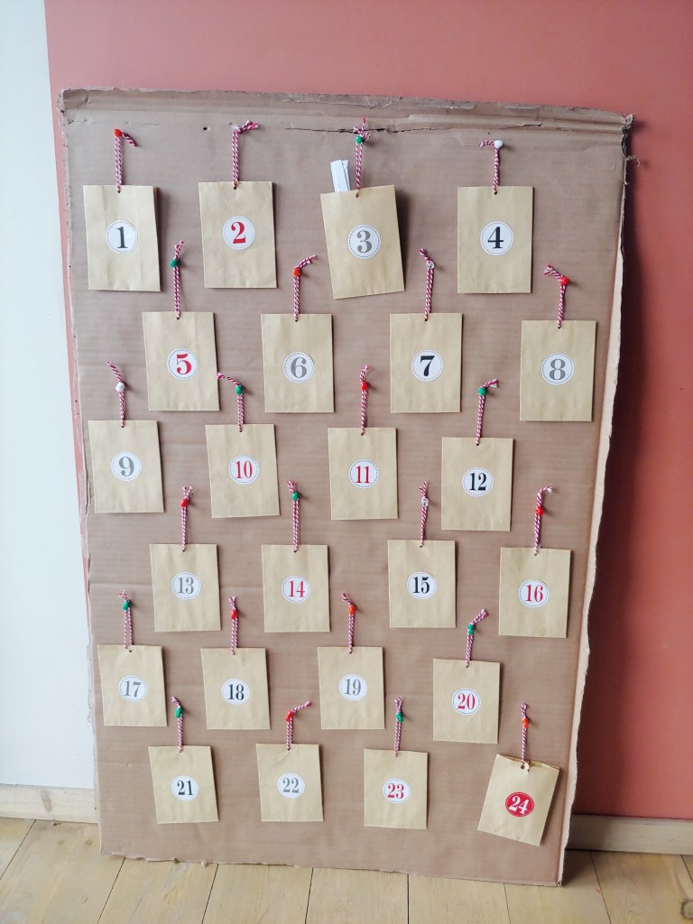 Visi uzdevumi tika sarkastīti datorā (katrs rakstīja savā šriftā un stiliņā), izdrukāti un salikti papīra maisiņos ar skaitļiem (tie mums bija vienu citu gadu, tāds “zero waste” gājiens sanācis 😅) un viss tika piestiprināts pie lielas kartona plāksnes.