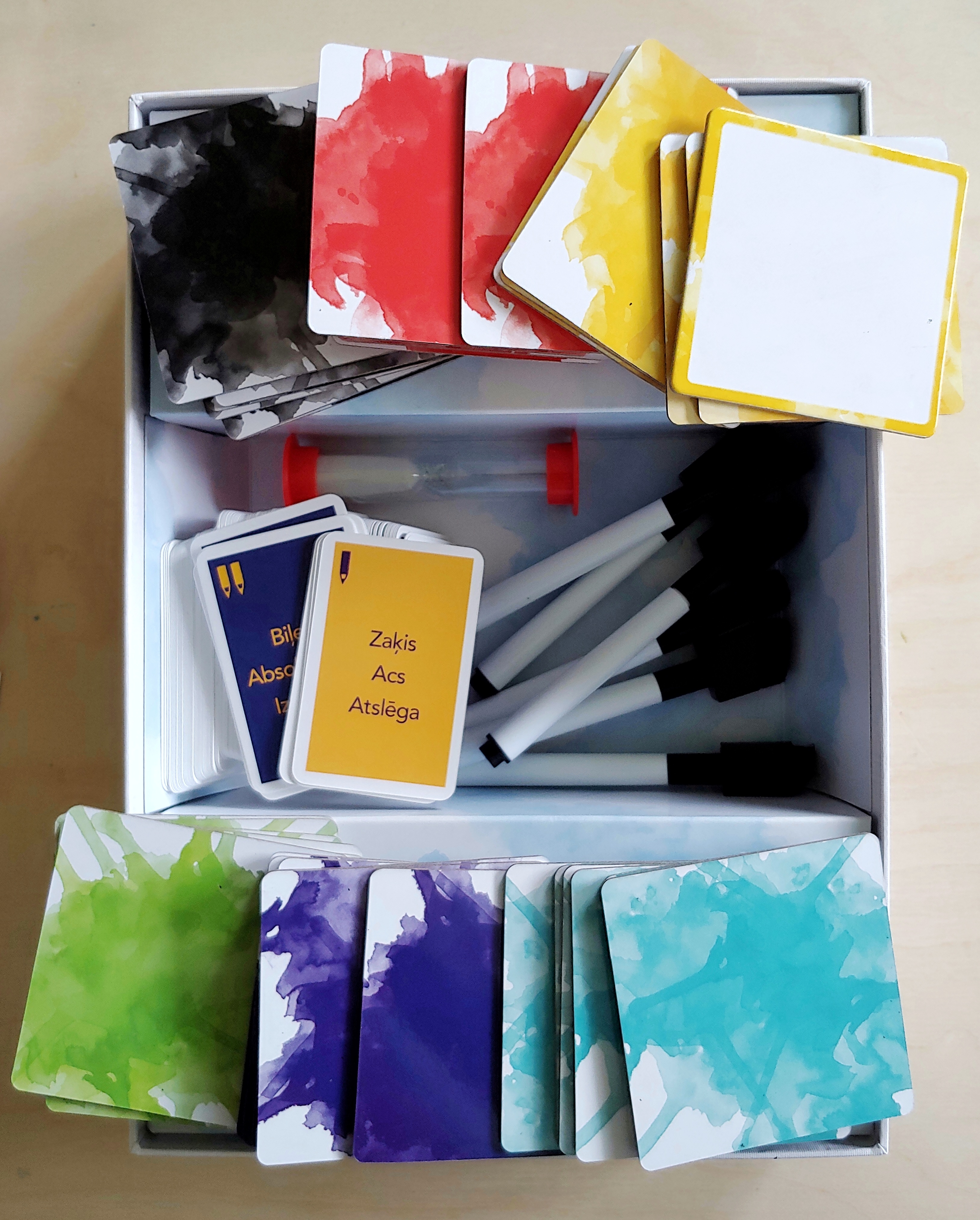 Spēlē ir 175 kartītes un uz katras ir 6 vārdi, kurus zīmēt. Vienā pusē vieglāki un otrā – grūtāki. Tātad ir ļoti daudz lietu, ko zīmēt un iespēju daudziem jaukiem kopīgiem brīžiem!